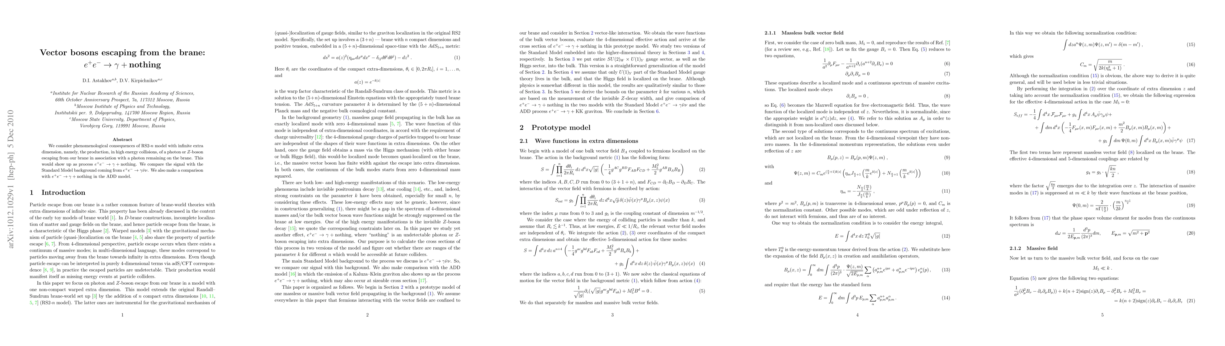 We consider phenomenological consequences of RS2-n model with infinite extra dimension, namely, the production, in high energy collisions, of a photon or Z-boson escaping from our brane in association with a photon remaining on the brane. This would show up as process $e^+e^-\rightarrow \gamma +$nothing. We compare the signal with the Standard Model background coming from $e^+e^- \rightarrow \gamma \bar{\nu} \nu$. We also make a comparison with $e^+e^-\rightarrow \gamma +$nothing in the ADD model.