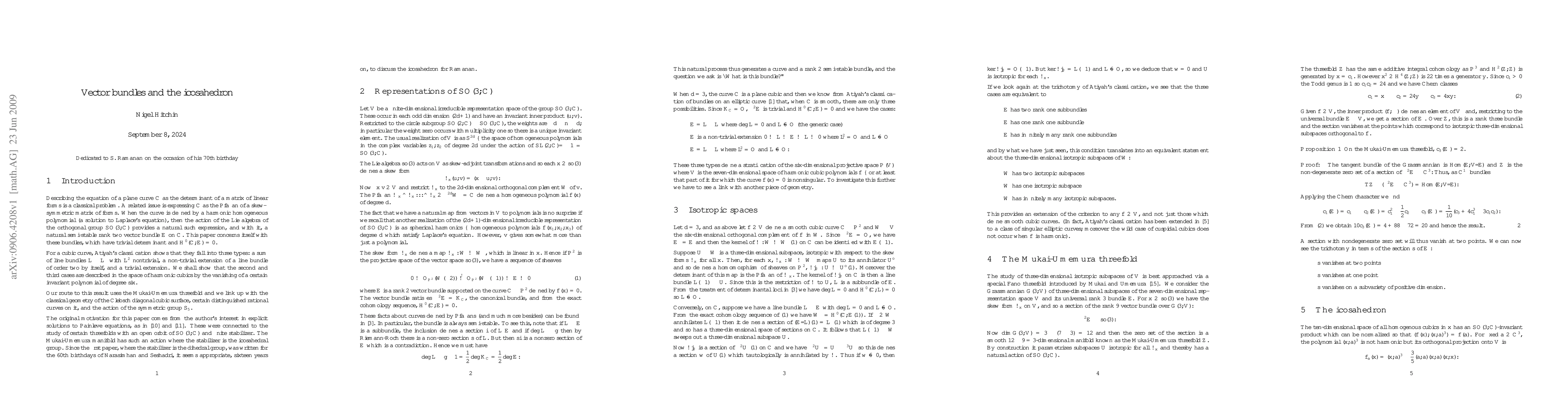 A plane curve C defined by a homogeneous polynomial satisfying Laplace's equation appears canonically as the vanishing of the Pfaffian of a skew-symmetric matrix of linear forms. As a consequence there is a natural semi-stable rank two vector bundle defined on C. We consider the case of degree 3, and apply Atiyah's classification of bundles to determine various invariant strata in the space of harmonic cubics. We encounter the Mukai-Umemura threefold and link up with the classical geometry of the Clebsch diagonal cubic surface, certain distinguished rational curves on it, and the action of the icosahedral group.