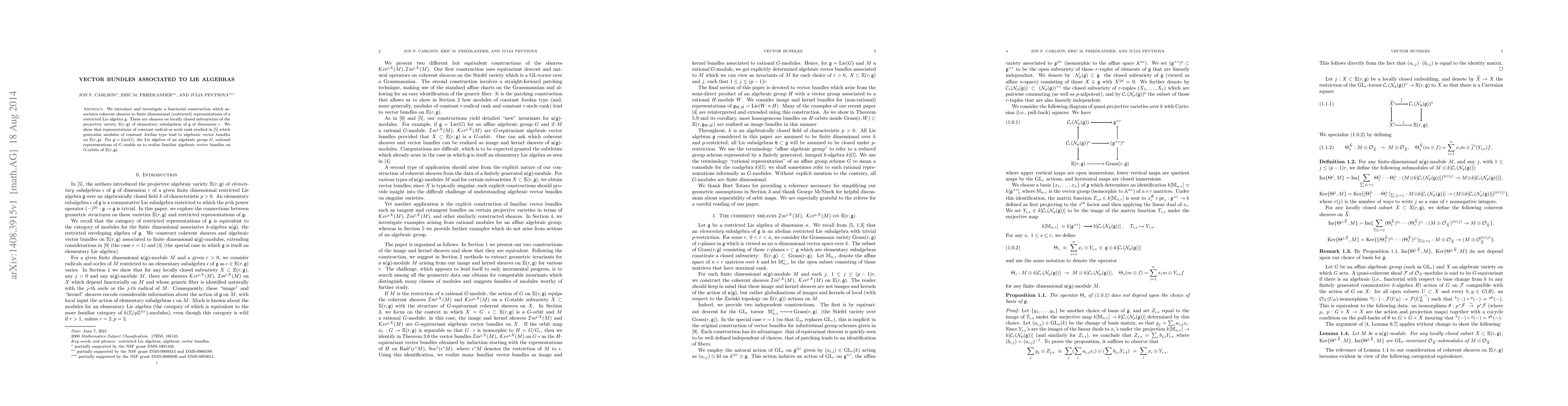 We introduce and investigate a functorial construction which associates coherent sheaves to finite dimensional (restricted) representations of a restricted Lie algebra $\mathfrak g$. These are sheaves on locally closed subvarieties of the projective variety $\mathbb E(r,\mathfrak g)$ of elementary subalgebras of $\mathfrak g$ of dimension $r$. We show that representations of constant radical or socle rank studied in \cite{CFP3} which generalize modules of constant Jordan type lead to algebraic vector bundles on $\mathbb E(r,\mathfrak g)$. For $\mathfrak g = Lie(G)$, the Lie algebra of an algebraic group $G$, rational representations of $G$ enable us to realize familiar algebraic vector bundles on $G$-orbits of $\mathbb E(r, \mathfrak g)$.