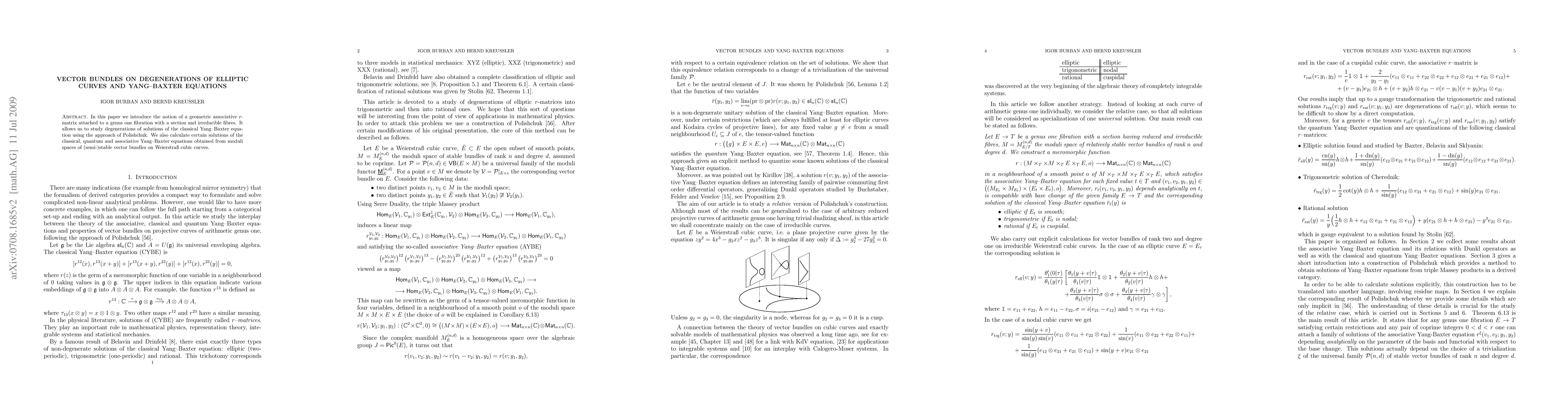 This paper introduces a geometric associative r-matrix for genus one fibrations with sections and irreducible fibers, allowing the study of degenerations in solutions of various Yang-Baxter equations, and computes specific solutions derived from moduli spaces of vector bundles on Weierstrass cubic curves.