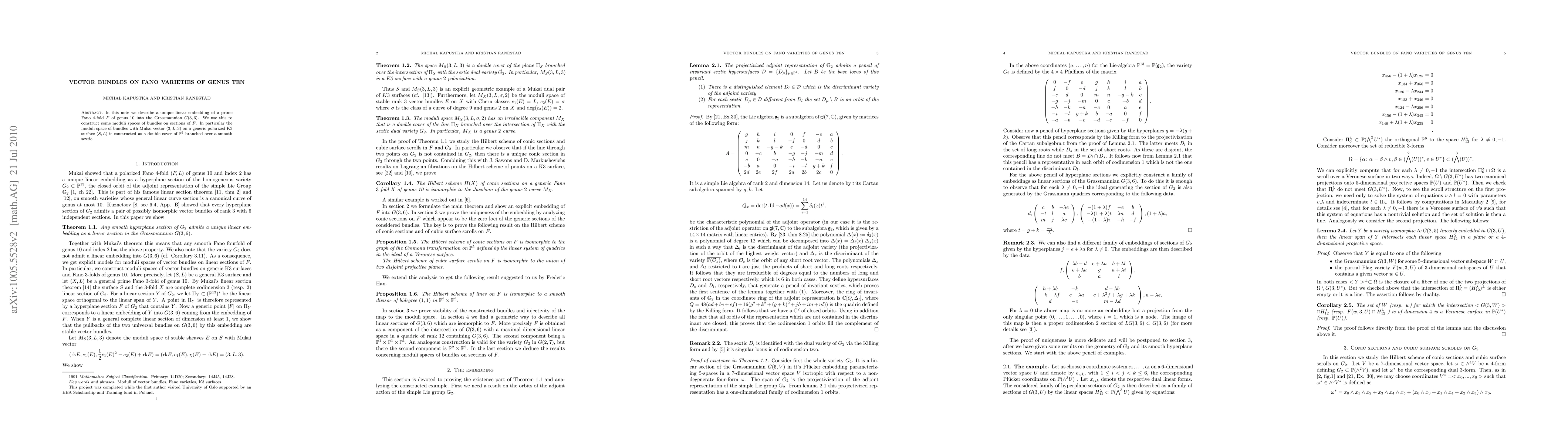 In this note we describe a unique linear embedding of a prime Fano 4-fold F of genus 10 into the Grassmannian G(3,6). We use this to construct some moduli spaces of bundles on linear sections of F. In particular the moduli space of bundles with Mukai vector (3,L,3) on a generic polarized K3 surface (S,L) of genus 10 is constructed as a double cover of the projective plane branched over a smooth sextic.