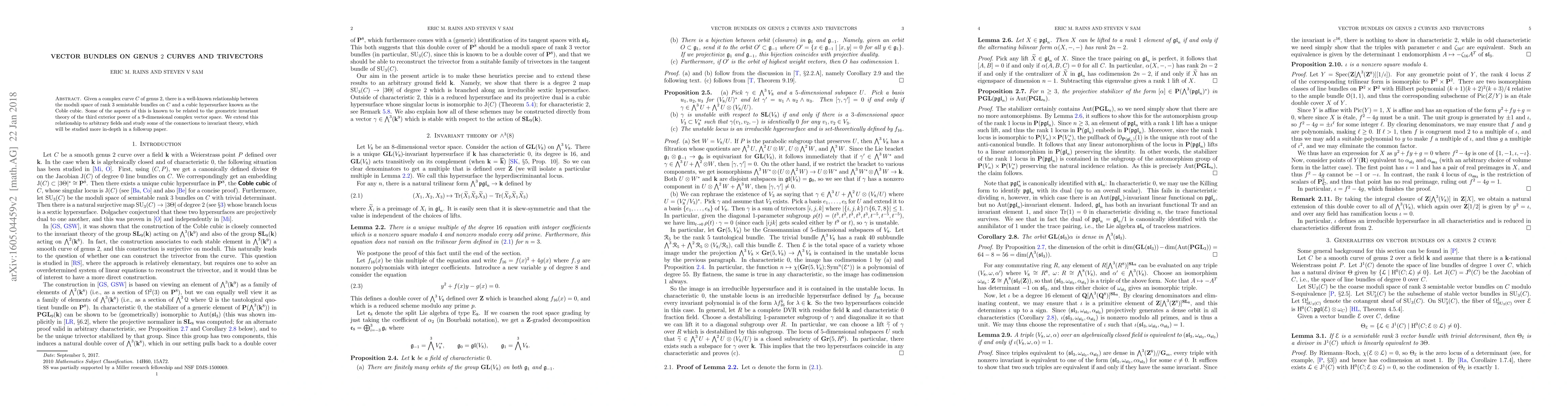 This paper explores the relationship between rank 3 semistable vector bundles on a genus 2 curve and the Coble cubic, extending this connection to arbitrary fields and linking it to invariant theory of the third exterior power of a 9-dimensional vector space. Further connections to invariant theory are to be detailed in a subsequent publication.