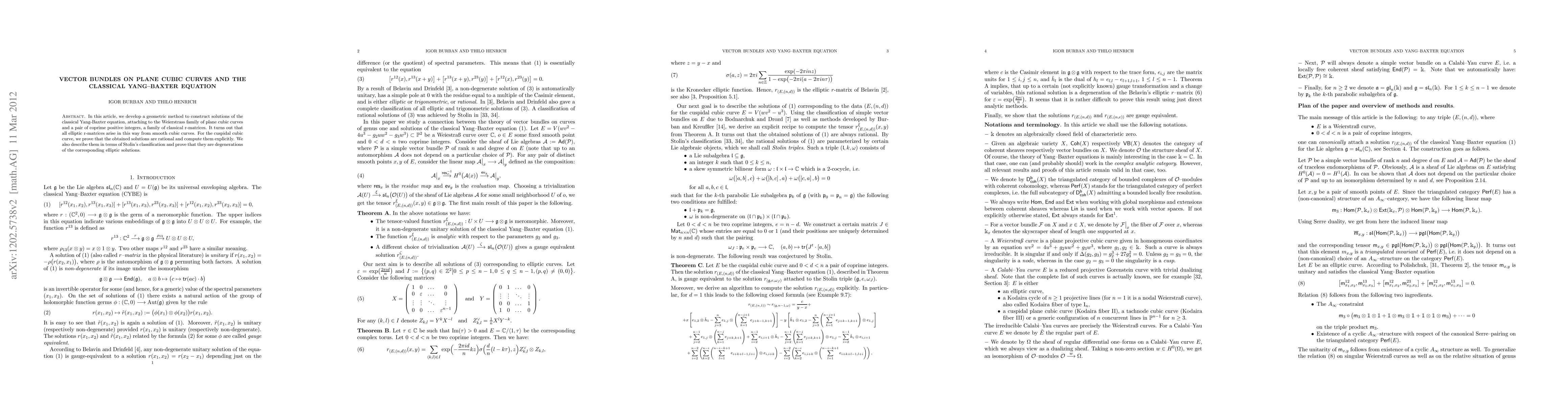 Summary: This paper presents a geometric approach to constructing solutions of the classical Yang-Baxter equation using vector bundles on plane cubic curves, demonstrating that all elliptic r-matrices originate from smooth cubic curves, while providing explicit rational solutions for the cuspidal case and linking them to Stolin's classification.
