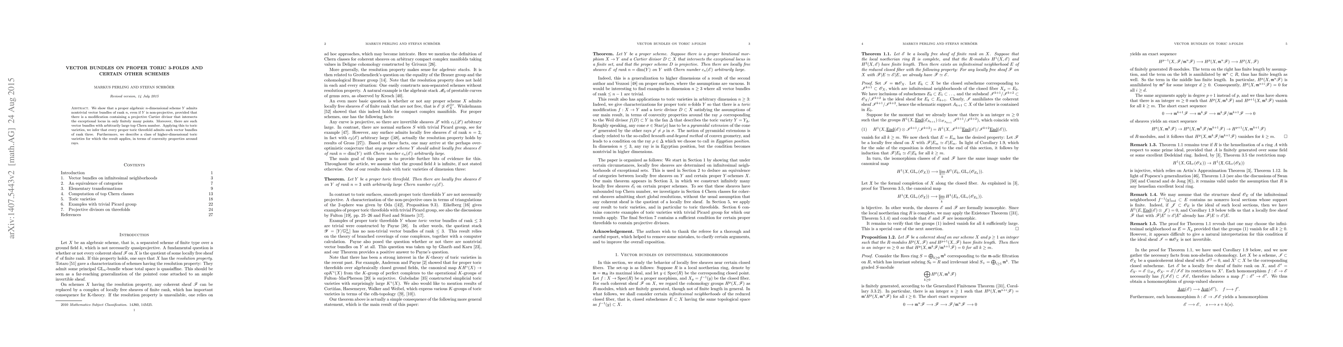 We show that a proper algebraic n-dimensional scheme Y admits nontrivial vector bundles of rank n, even if Y is non-projective, provided that there is a modification containing a projective Cartier divisor that intersects the exceptional locus in only finitely many points. Moreover, there are such vector bundles with arbitrarily large top Chern number. Applying this to toric varieties, we infer that every proper toric threefold admits such vector bundles of rank three. Furthermore, we describe a class of higher-dimensional toric varieties for which the result applies, in terms of convexity properties around rays.