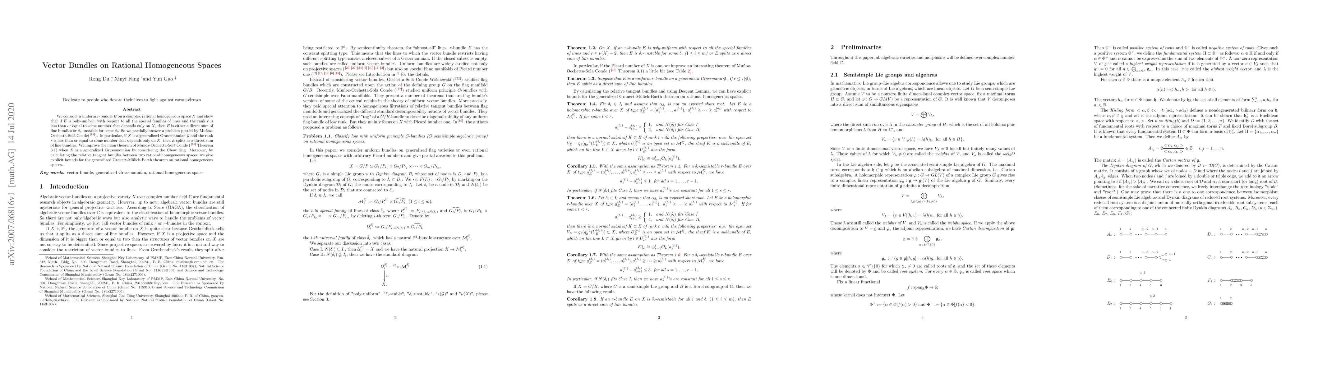 We consider a uniform $r$-bundle $E$ on a complex rational homogeneous space $X$ %over complex number field $\mathbb{C}$ and show that if $E$ is poly-uniform with respect to all the special families of lines and the rank $r$ is less than or equal to some number that depends only on $X$, then $E$ is either a direct sum of line bundles or $\delta_i$-unstable for some $\delta_i$. So we partially answer a problem posted by Mu\~{n}oz-Occhetta-Sol\'{a} Conde. In particular, if $X$ is a generalized Grassmannian $\mathcal{G}$ and the rank $r$ is less than or equal to some number that depends only on $X$, then $E$ splits as a direct sum of line bundles. We improve the main theorem of Mu\~{n}oz-Occhetta-Sol\'{a} Conde when $X$ is a generalized Grassmannian by considering the Chow rings. Moreover, by calculating the relative tangent bundles between two rational homogeneous spaces, we give explicit bounds for the generalized Grauert-M\"{u}lich-Barth theorem on rational homogeneous spaces.