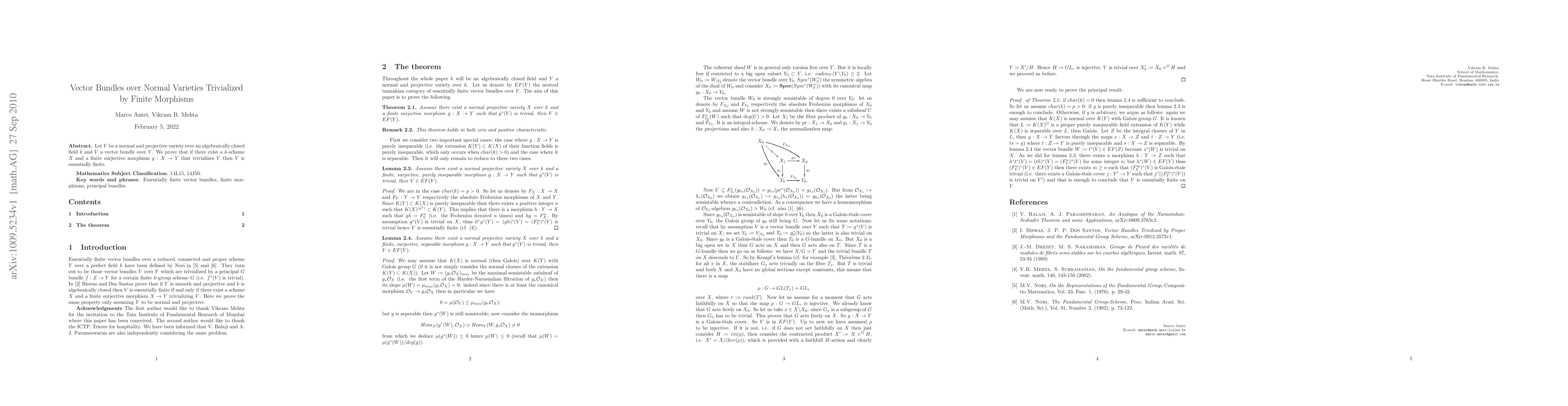 Let $Y$ be a normal and projective variety over an algebraically closed field $k$ and $V$ a vector bundle over $Y$. We prove that if there exist a $k$-scheme $X$ and a finite surjective morphism $g:X\to Y$ that trivializes $V$ then $V$ is essentially finite.