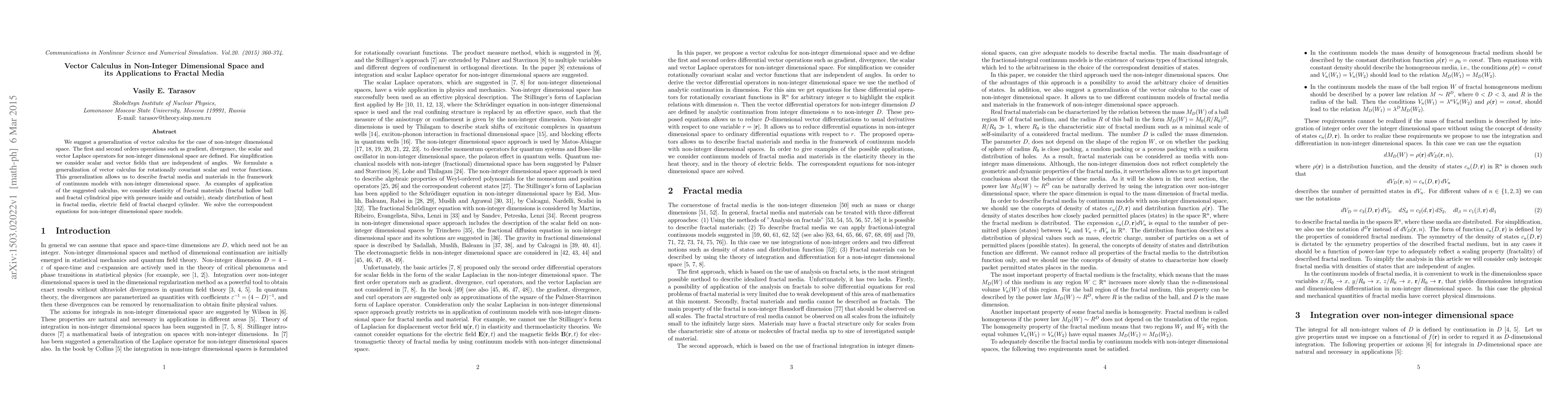 This paper generalizes vector calculus for non-integer dimensional spaces, defining gradient, divergence, and Laplace operators. It applies this framework to describe and analyze fractal media, including elasticity, heat distribution, and electric fields in fractal materials.