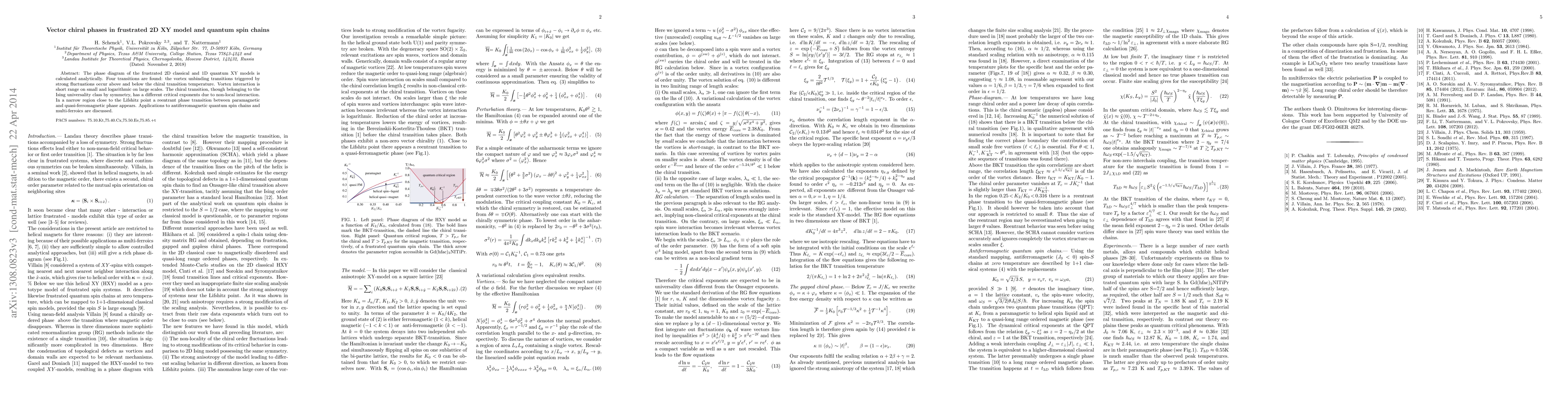 The phase diagram of the frustrated 2D classical and 1D quantum XY models is calculated analytically. Four transitions are found: the vortex unbinding transitions triggered by strong fluctuations occur above and below the chiral transition temperature. Vortex interaction is short range on small and logarithmic on large scales. The chiral transition, though belonging to the Ising universality class by symmetry, has different critical exponents due to nonlocal interaction. In a narrow region close to the Lifshitz point a reentrant phase transition between paramagnetic and quasiferromagnetic phase appears. Applications to antiferromagnetic quantum spin chains and multiferroics are discussed.