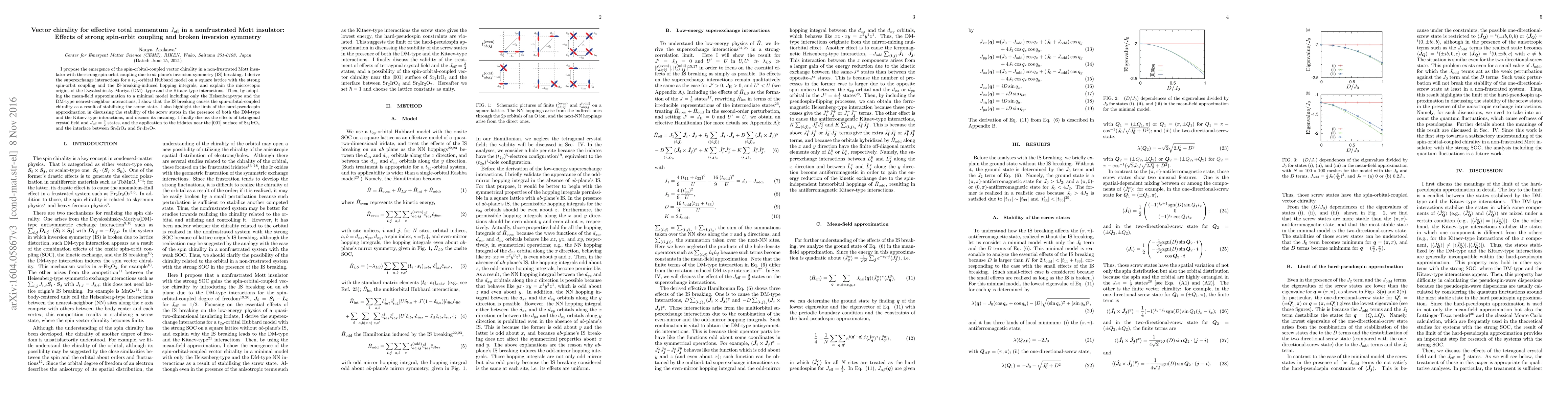 I propose the emergence of the spin-orbital-coupled vector chirality in a non-frustrated Mott insulator with the strong spin-orbit coupling due to $ab$-plane's inversion-symmetry (IS) breaking. I derive the superexchange interactions for a $t_{2g}$-orbital Hubbard model on a square lattice with the strong spin-orbit coupling and the IS-breaking-induced hopping integrals, and explain the microscopic origins of the Dzyaloshinsky-Moriya (DM) -type and the Kitaev-type interactions. Then, by adopting the mean-field approximation to a minimal model including only the Heisenberg-type and the DM-type nearest-neighbor interactions, I show that the IS breaking causes the spin-orbital-coupled chirality as a result of stabilizing the screw state. I also highlight the limit of the hard-pseudospin approximation in discussing the stability of the screw states in the presence of both the DM-type and the Kitaev-type interactions, and discuss its meaning. I finally discuss the effects of tetragonal crystal field and $J_{\textrm{eff}}=\frac{3}{2}$ states, and the application to the iridates near the $[001]$ surface of Sr$_{2}$IrO$_{4}$ and the interface between Sr$_{2}$IrO$_{4}$ and Sr$_{3}$Ir$_{2}$O$_{7}$.