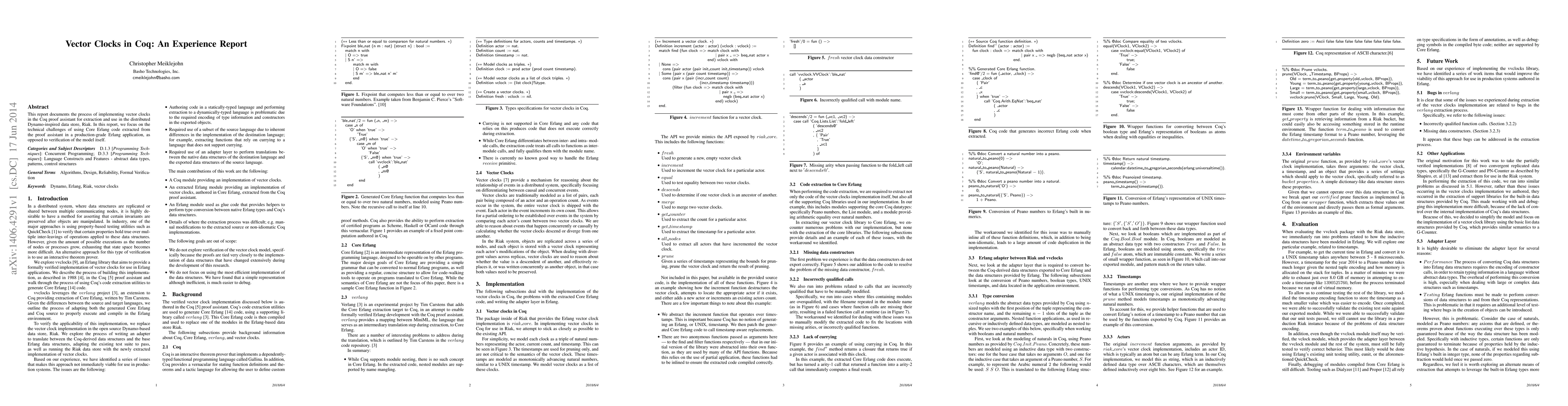 This report details the implementation of vector clocks in Coq for a distributed data store, highlighting technical challenges in extracting and integrating Core Erlang code into a production-grade Erlang application. The focus is on practical issues rather than model verification.