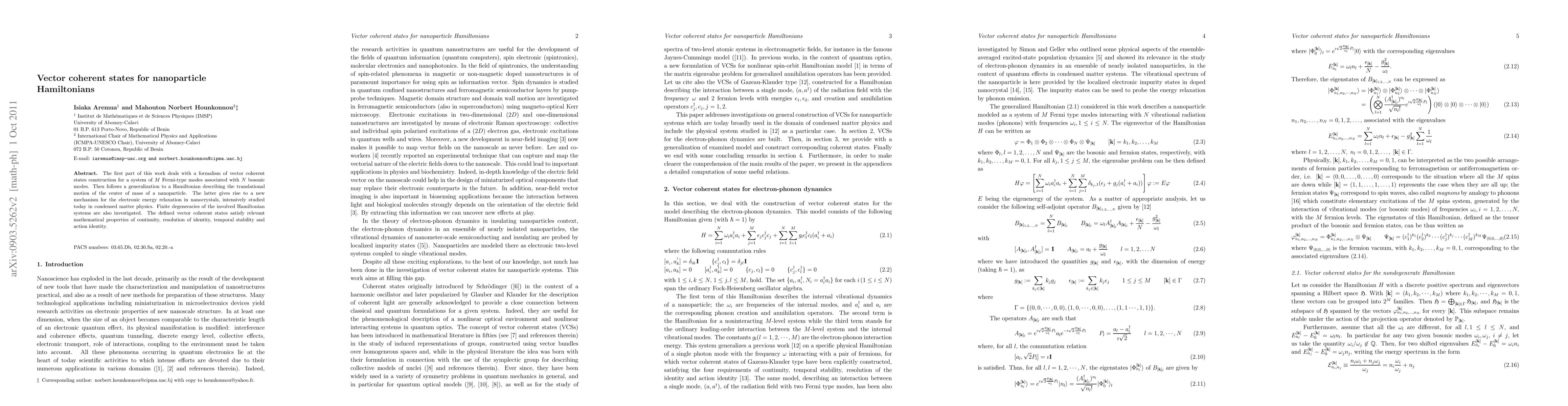 The first part of this work deals with a formalism of vector coherent states construction for a system of $M$ Fermi-type modes associated with $N$ bosonic modes. Then follows a generalization to a Hamiltonian describing the translational motion of the center of mass of a nanoparticle. The latter gives rise to a new mechanism for the electronic energy relaxation in nanocrystals, intensively studied today in condensed matter physics. Finite degeneracies of the involved Hamiltonian systems are also investigated. The defined vector coherent states satisfy relevant mathematical properties of continuity, resolution of identity, temporal stability and action identity.