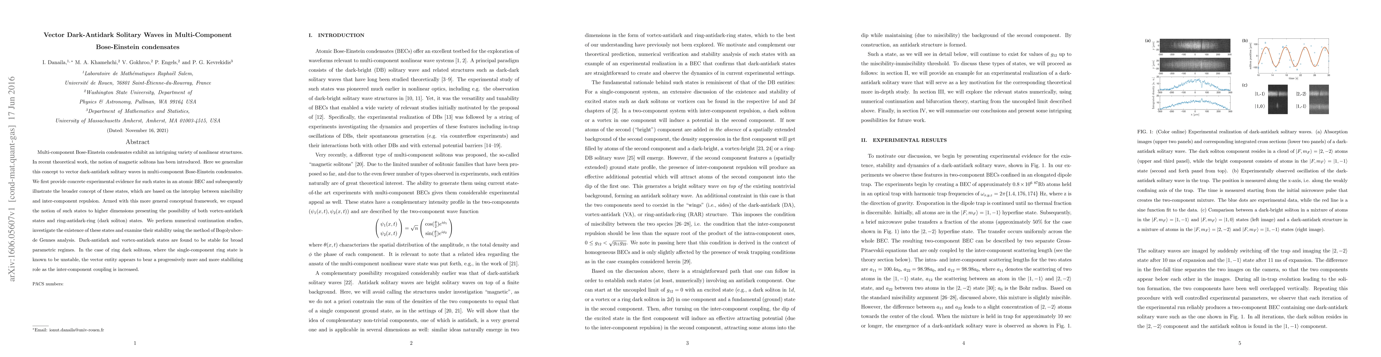 This paper explores vector dark-antidark solitary waves in multi-component Bose-Einstein condensates, providing experimental evidence for these states in atomic BECs and demonstrating their stability through numerical continuation and Bogolyubov-de Gennes analysis. The study extends these findings to higher dimensions, revealing stable vortex-antidark and ring-antidark-ring states.
