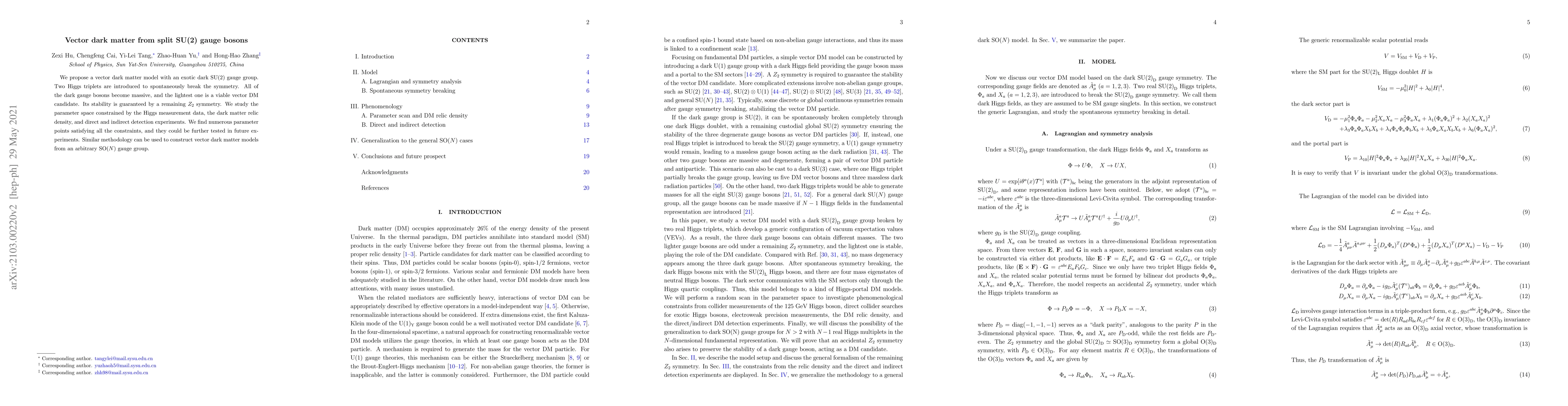 This paper proposes a vector dark matter model based on a split SU(2) gauge group, utilizing two Higgs triplets for symmetry breaking. The lightest dark gauge boson, stabilized by a Z_2 symmetry, is identified as a viable dark matter candidate, with numerous parameter points meeting observational constraints and potential for future experimental validation.
