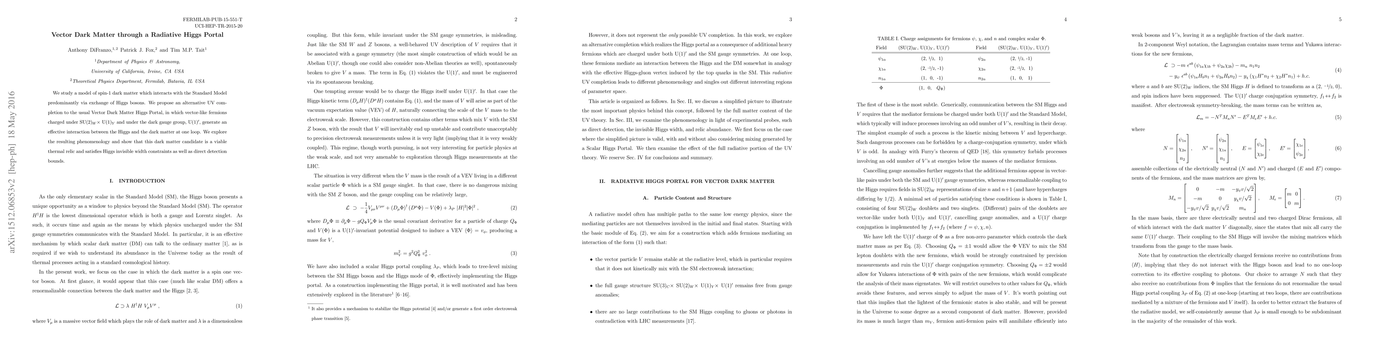 We study a model of spin-1 dark matter which interacts with the Standard Model predominantly via exchange of Higgs bosons. We propose an alternative UV completion to the usual Vector Dark Matter Higgs Portal, in which vector-like fermions charged under SU(2)$_W \times$ U(1)$_Y$ and under the dark gauge group, U(1)$^\prime$, generate an effective interaction between the Higgs and the dark matter at one loop. We explore the resulting phenomenology and show that this dark matter candidate is a viable thermal relic and satisfies Higgs invisible width constraints as well as direct detection bounds.