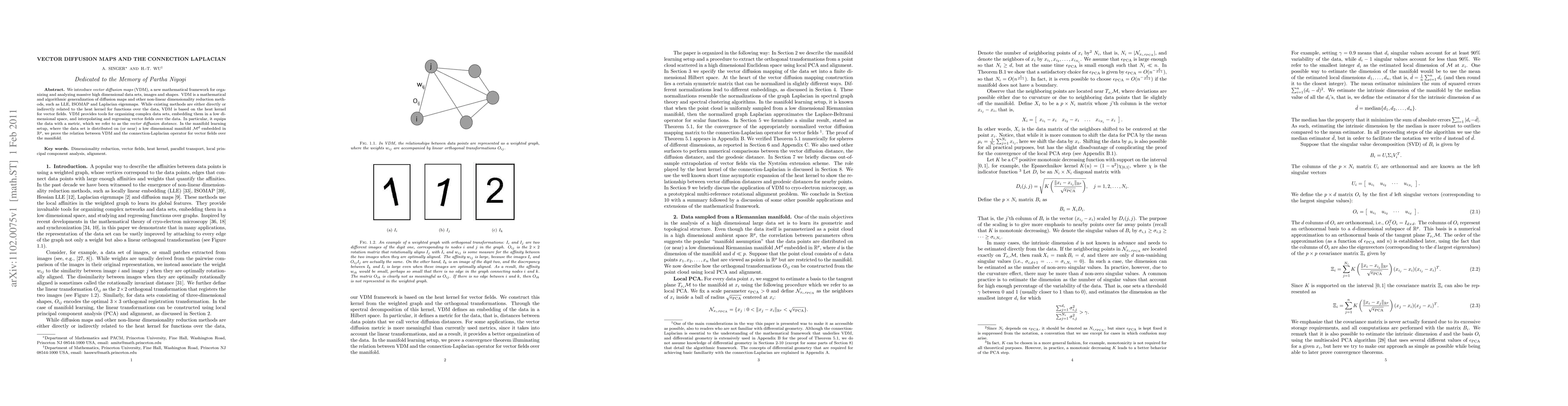 This paper introduces vector diffusion maps (VDM), a novel framework for analyzing high-dimensional data, generalizing existing non-linear dimensionality reduction methods. It establishes a connection between VDM and the connection-Laplacian operator for vector fields, providing a metric for organizing and embedding complex data.