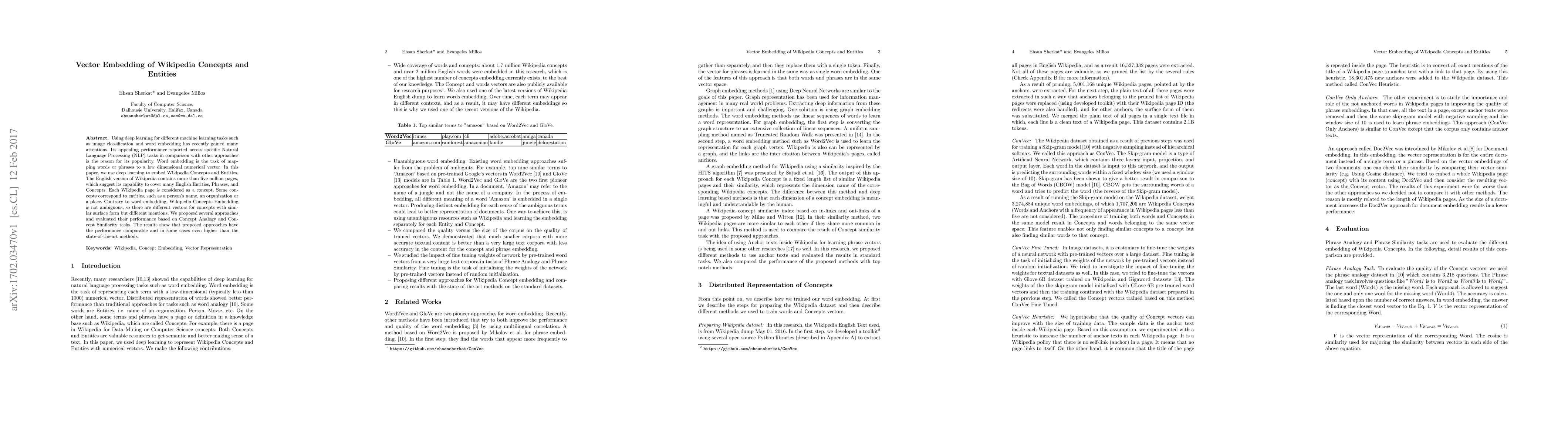 This paper explores deep learning techniques to embed Wikipedia concepts and entities into low-dimensional vectors, demonstrating superior performance in Concept Analogy and Similarity tasks compared to state-of-the-art methods. The approach distinguishes between concepts with similar surface forms but different meanings.