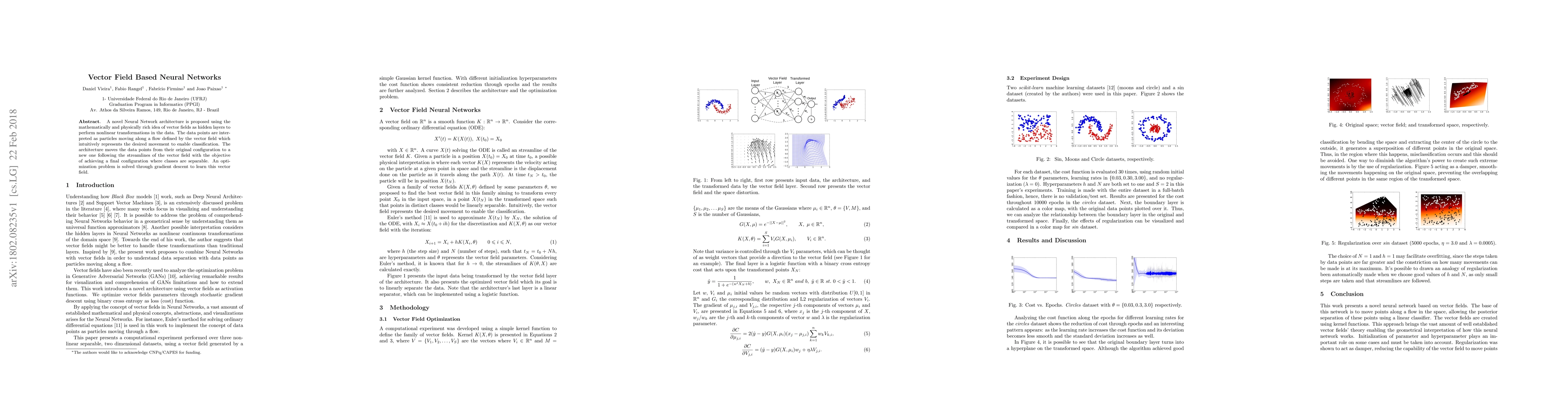 This paper introduces a new neural network architecture using vector fields as hidden layers for nonlinear data transformations. Data points are treated as particles moving along a flow, guided by the vector field to achieve separable class configurations. The vector field is learned through gradient descent to solve an optimization problem.