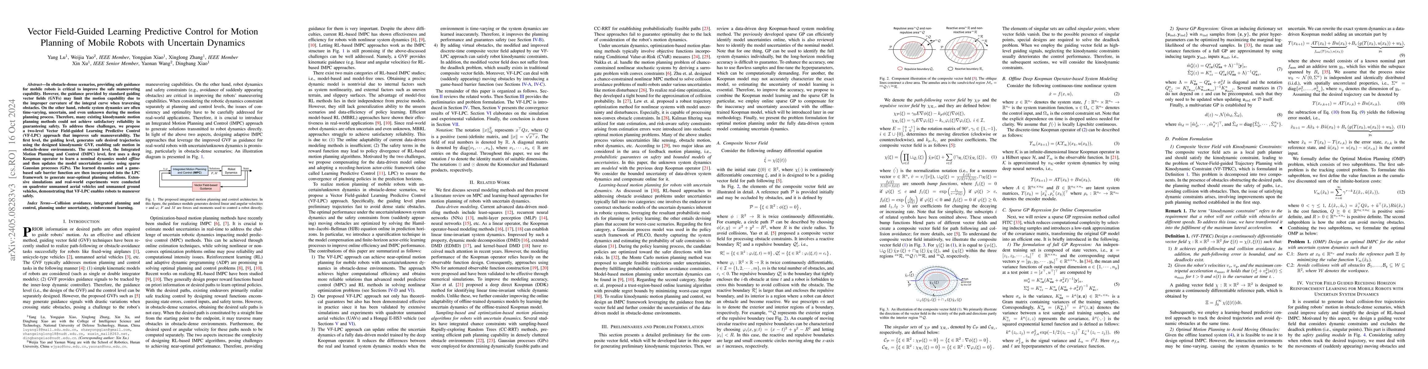 Safe maneuvering capability is critical for mobile robots in complex environments. However, robotic system dynamics are often time-varying, uncertain, or even unknown during the motion planning and control process. Therefore, many existing model-based reinforcement learning (RL) methods could not achieve satisfactory reliability in guaranteeing safety. To address this challenge, we propose a two-level Vector Field-guided Learning Predictive Control (VF-LPC) approach that guarantees safe maneuverability. The first level, the guiding level, generates safe desired trajectories using the designed kinodynamic guiding vector field, enabling safe motion in obstacle-dense environments. The second level, the Integrated Motion Planning and Control (IMPC) level, first uses the deep Koopman operator to learn a nominal dynamics model offline and then updates the model uncertainties online using sparse Gaussian processes (GPs). The learned dynamics and game-based safe barrier function are then incorporated into the learning predictive control framework to generate near-optimal control sequences. We conducted tests to compare the performance of VF-LPC with existing advanced planning methods in an obstacle-dense environment. The simulation results show that it can generate feasible trajectories quickly. Then, VF-LPC is evaluated against motion planning methods that employ model predictive control (MPC) and RL in high-fidelity CarSim software. The results show that VF-LPC outperforms them under metrics of completion time, route length, and average solution time. We also carried out path-tracking control tests on a racing road to validate the model uncertainties learning capability. Finally, we conducted real-world experiments on a Hongqi E-HS3 vehicle, further validating the VF-LPC approach's effectiveness.