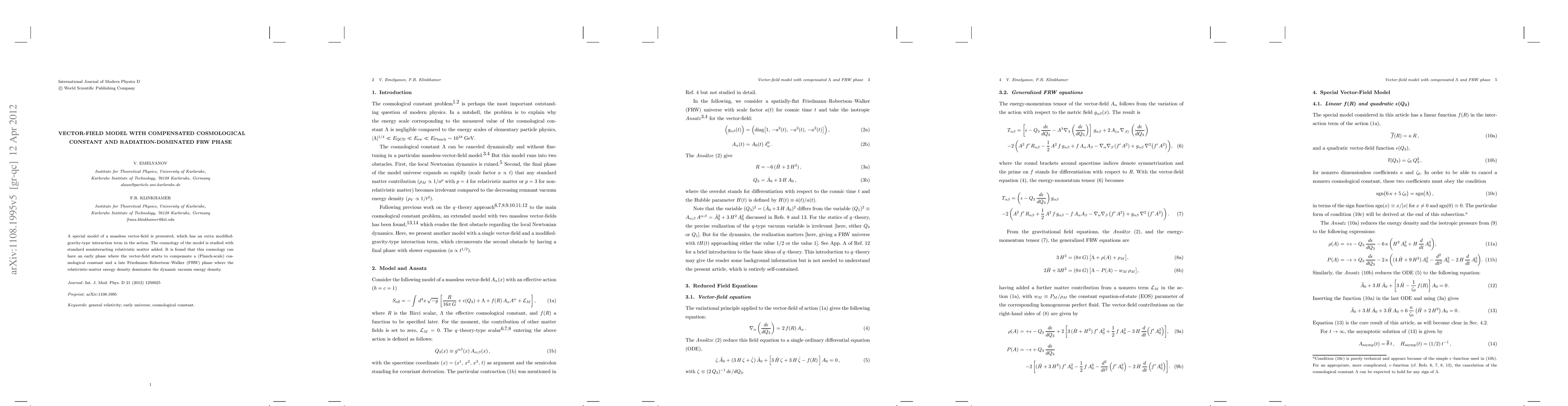 A new model of a massless vector field is proposed, which includes an interaction term that compensates a cosmological constant in the early universe, followed by a late phase dominated by relativistic matter energy density.