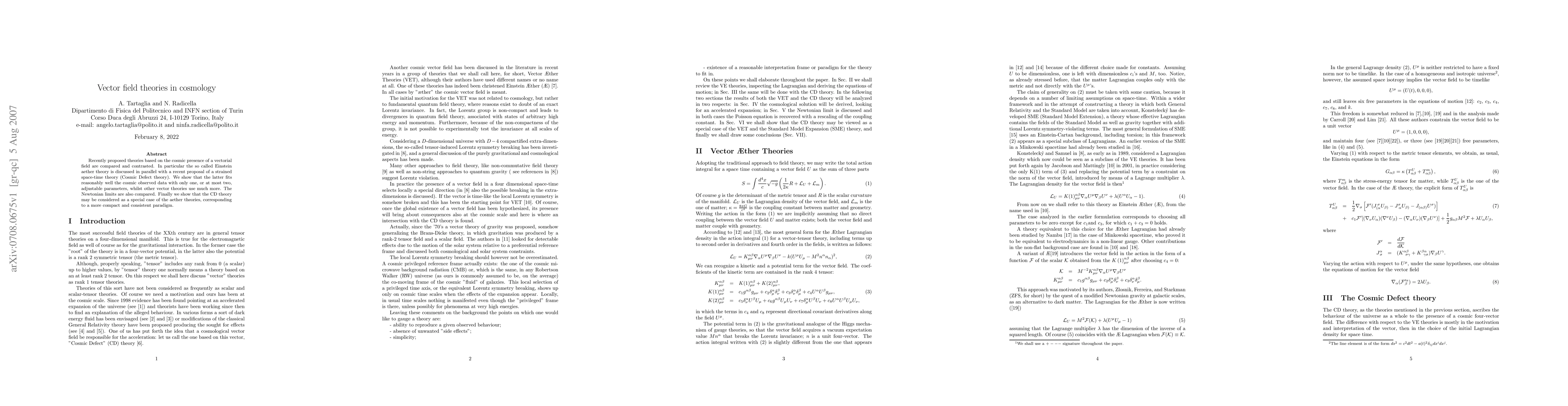 Recently proposed theories based on the cosmic presence of a vectorial field are compared and contrasted. In particular the so called Einstein aether theory is discussed in parallel with a recent proposal of a strained space-time theory (Cosmic Defect theory). We show that the latter fits reasonably well the cosmic observed data with only one, or at most two, adjustable parameters, whilst other vector theories use much more. The Newtonian limits are also compared. Finally we show that the CD theory may be considered as a special case of the aether theories, corresponding to a more compact and consistent paradigm.
