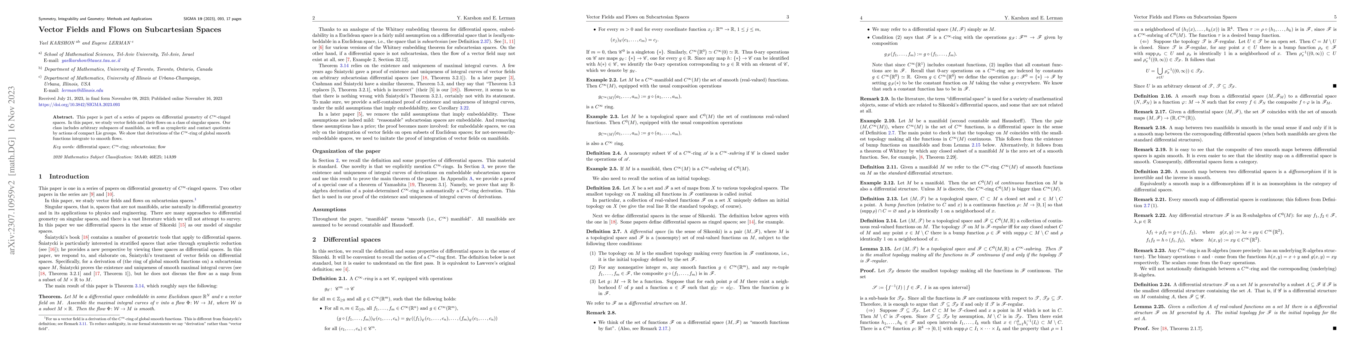 This paper explores vector fields and their flows on subcartesian spaces, including subspaces of manifolds and symplectic and contact quotients by compact Lie group actions. It demonstrates that derivations of the $C^\infty$-ring of smooth functions integrate to smooth flows.