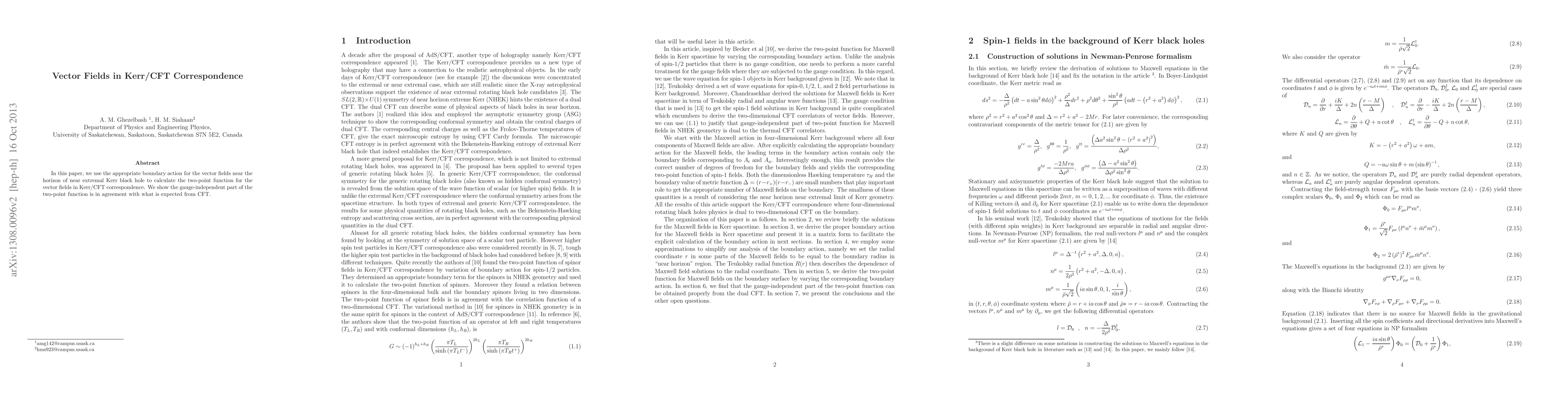 This research calculates the two-point function for vector fields near the horizon of a near extremal Kerr black hole, demonstrating that the gauge-independent part aligns with conformal field theory (CFT) expectations in the Kerr/CFT correspondence.