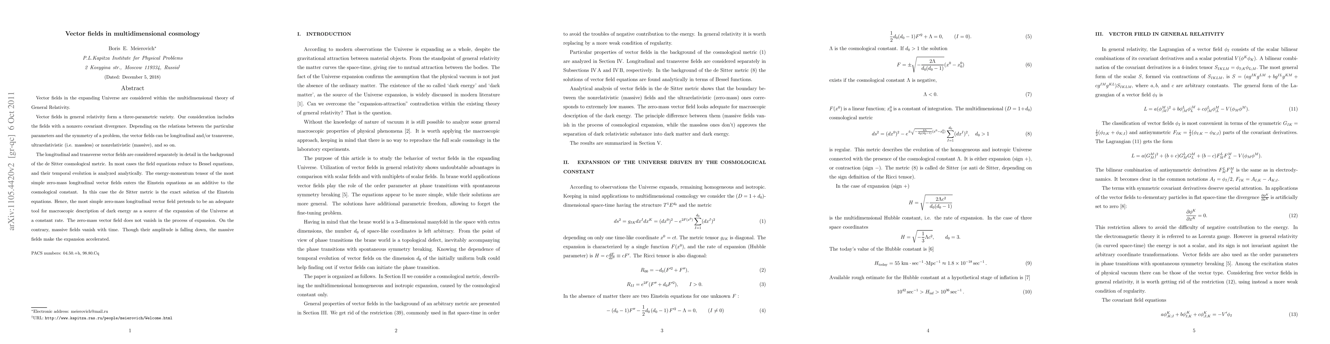 Vector fields in the expanding Universe are considered within the multidimensional theory of General Relativity. Vector fields in general relativity form a three-parametric variety. Our consideration includes the fields with a nonzero covariant divergence. Depending on the relations between the particular parameters and the symmetry of a problem, the vector fields can be longitudinal and/or transverse, ultrarelativistic (i.e. massless) or nonrelativistic (massive), and so on. The longitudinal and transverse vector fields are considered separately in detail in the background of the de Sitter cosmological metric. In most cases the field equations reduce to Bessel equations, and their temporal evolution is analyzed analytically. The energy-momentum tensor of the most simple zero-mass longitudinal vector fields enters the Einstein equations as an additive to the cosmological constant. In this case the de Sitter metric is the exact solution of the Einstein equations. Hence, the most simple zero-mass longitudinal vector field pretends to be an adequate tool for macroscopic description of dark energy as a source of the expansion of the Universe at a constant rate. The zero-mass vector field does not vanish in the process of expansion. On the contrary, massive fields vanish with time. Though their amplitude is falling down, the massive fields make the expansion accelerated. The macroscopic analysis of vector fields in cosmology gives up the hope that the major puzzle -- attraction between individual objects and expansion of the Universe as a whole -- can be solved within the Einstein's theory of general relativity.
