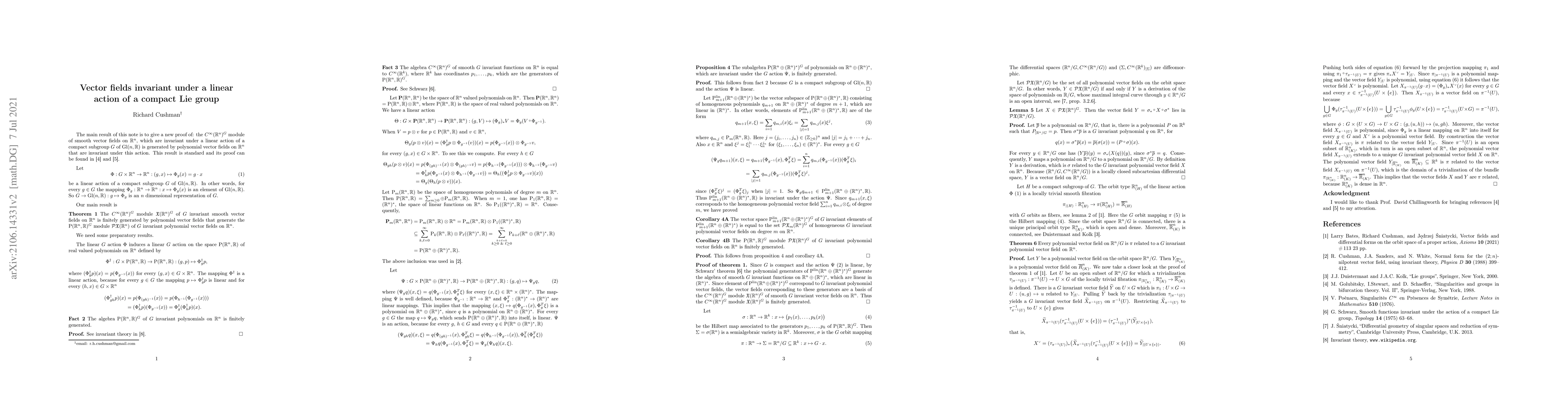 Summary: The paper demonstrates that the module of smooth vector fields on ${\mathbb{R}}^n$ invariant under the linear action of a compact Lie group $G$ is finitely generated by polynomial vector fields that also respect the group's action. This result provides a structural understanding of invariant vector fields in the context of compact Lie group actions.