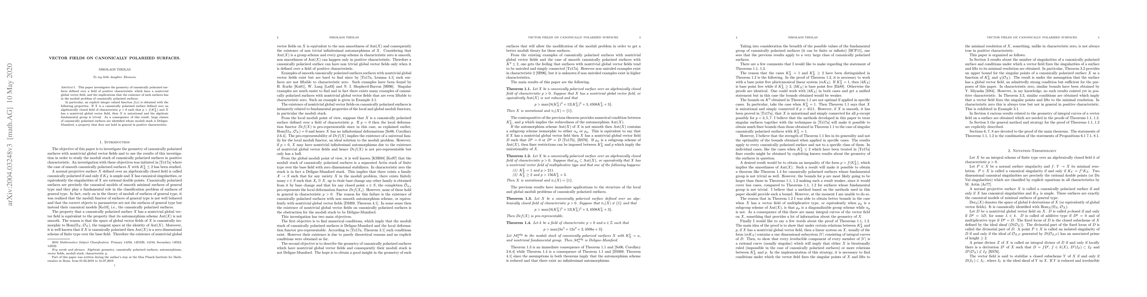 This paper generalizes previous results on vector fields on canonically polarized surfaces in positive characteristic, extending them to surfaces with canonical singularities. It establishes that such surfaces are unirational with trivial algebraic fundamental groups, leading to the identification of large classes with Deligne-Mumford moduli stacks.