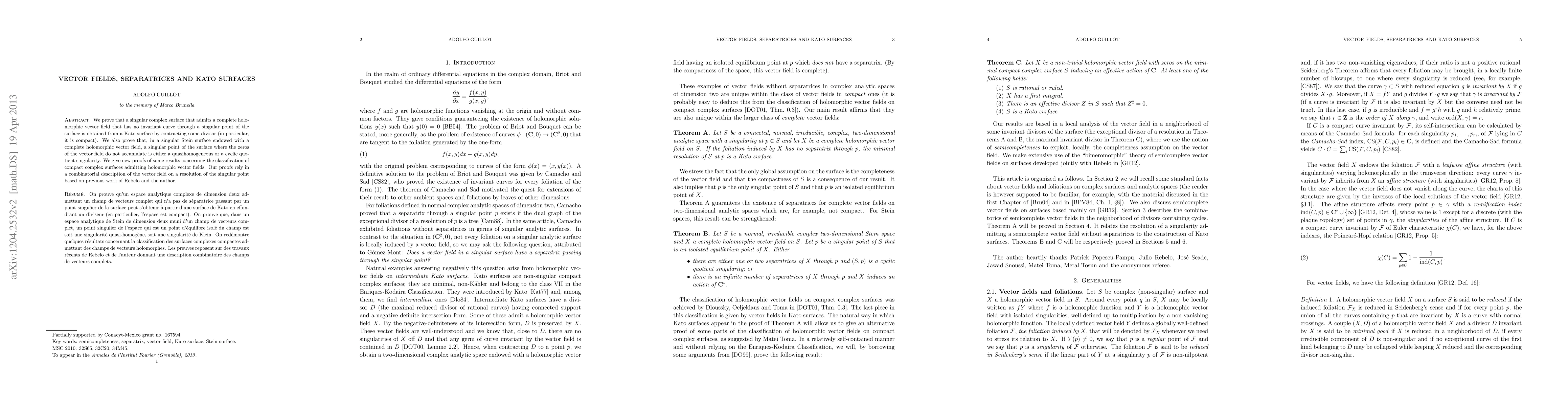 This paper proves that a singular complex surface with a complete holomorphic vector field lacking invariant curves through a singular point is derived from a Kato surface via divisor contraction. It also shows that in a singular Stein surface with a complete holomorphic vector field, singular points where vector field zeroes do not accumulate are quasihomogeneous or cyclic quotient singularities.