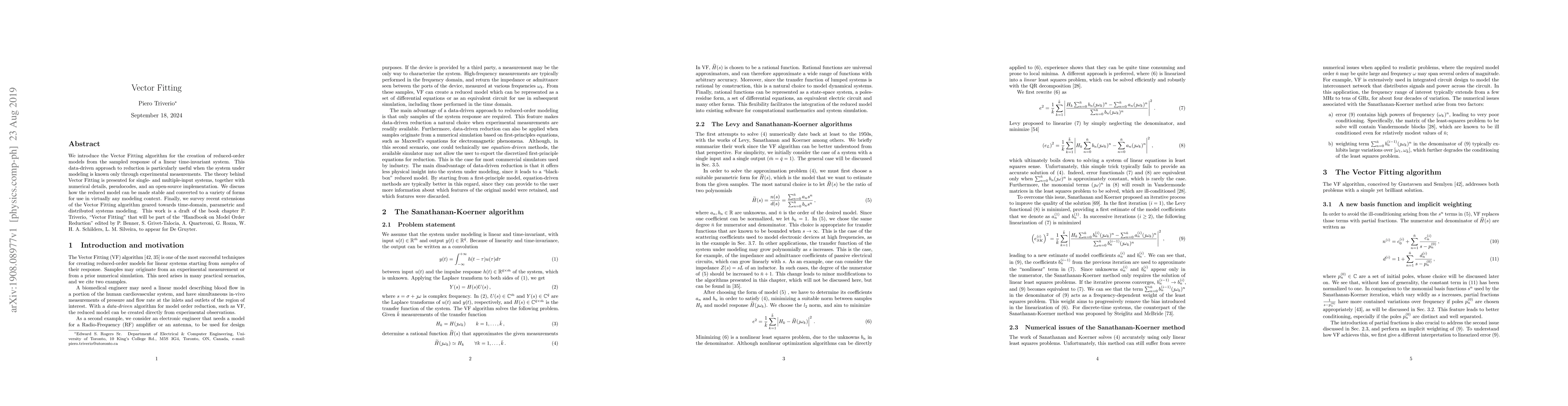The Vector Fitting algorithm creates reduced-order models from experimental data of linear time-invariant systems, offering a data-driven approach for system modeling. It includes stability measures and can be adapted for various modeling contexts, with recent extensions for time-domain, parametric, and distributed systems.