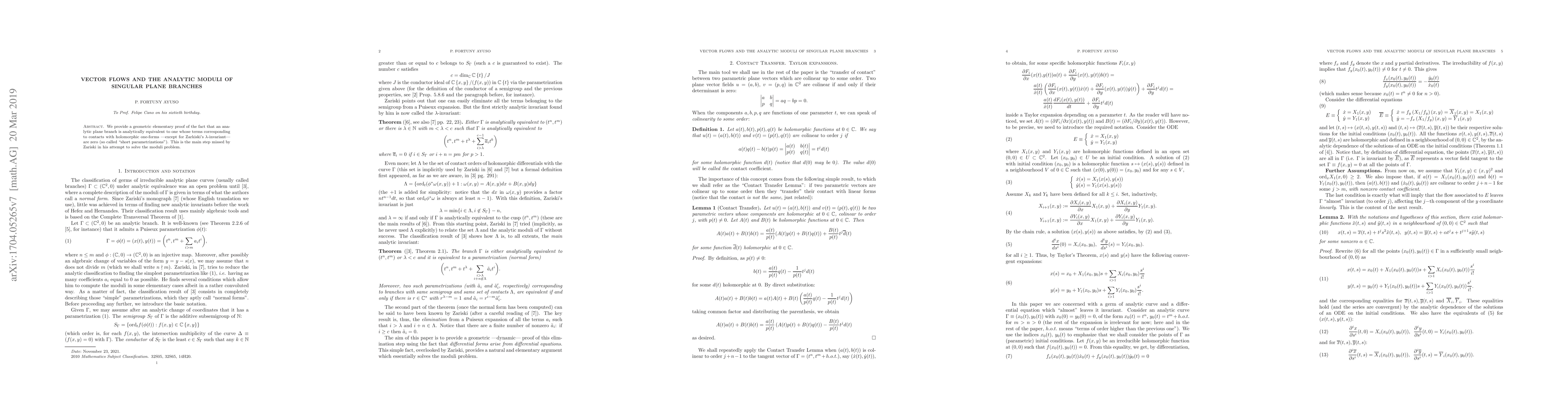 We provide a geometric elementary proof of the fact that an analytic plane branch is analytically equivalent to one whose terms corresponding to contacts with holomorphic one-forms -- except for Zariski's $\lambda$-invariant -- are zero (so called "short parametrizations"). This is the main step missed by Zariski in his attempt to solve the moduli problem.