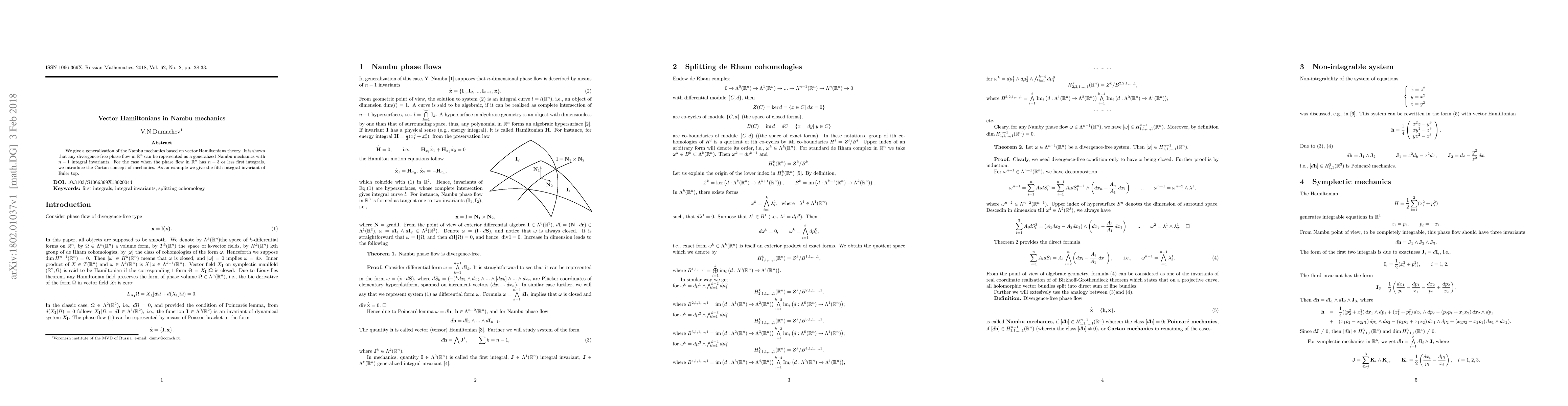 This paper generalizes Nambu mechanics using vector Hamiltonians, showing that any divergence-free phase flow in $\mathbb{R}^n$ can be represented with $n-1$ integral invariants. It introduces the Cartan concept for phase flows with $n-3$ or fewer first integrals, exemplified by the fifth integral invariant of the Euler top.