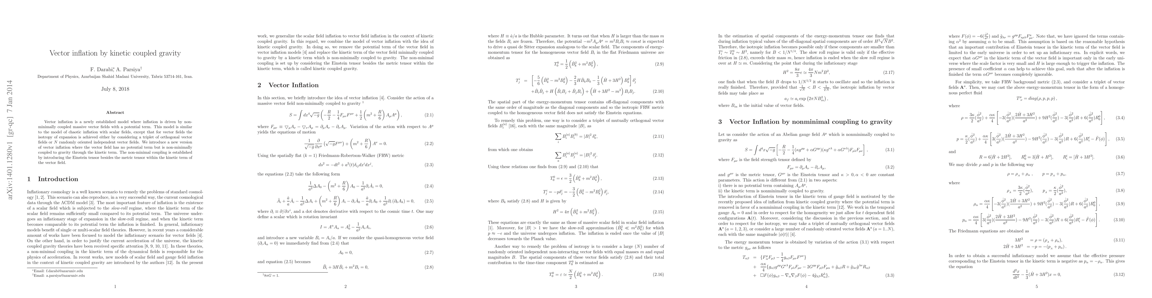 Vector inflation is a newly established model where inflation is driven by non-minimally coupled massive vector fields with a potential term. This model is similar to the model of chaotic inflation with scalar fields, except that for vector fields the isotropy of expansion is achieved either by considering a triplet of orthogonal vector fields or $N$ randomly oriented independent vector fields. We introduce a new version of vector inflation where the vector field has no potential term but is non-minimally coupled to gravity through the kinetic term. The non-minimal coupling is established by introducing the Einstein tensor besides the metric tensor within the kinetic term of the vector field.