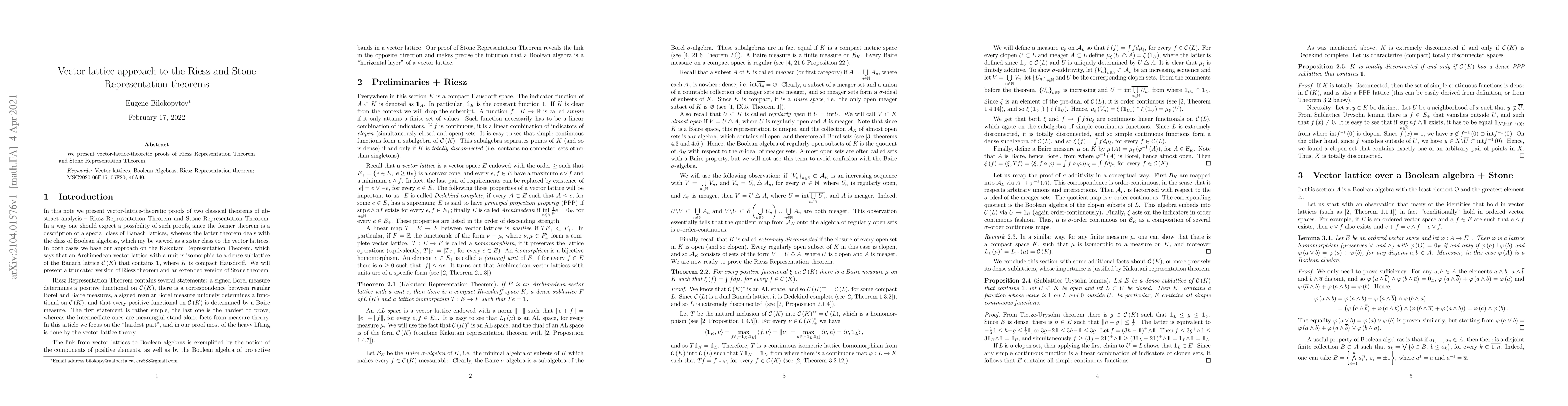 Summary: This paper provides vector lattice-theoretic proofs for both the Riesz Representation Theorem and the Stone Representation Theorem, offering a novel approach to these fundamental results in functional analysis.