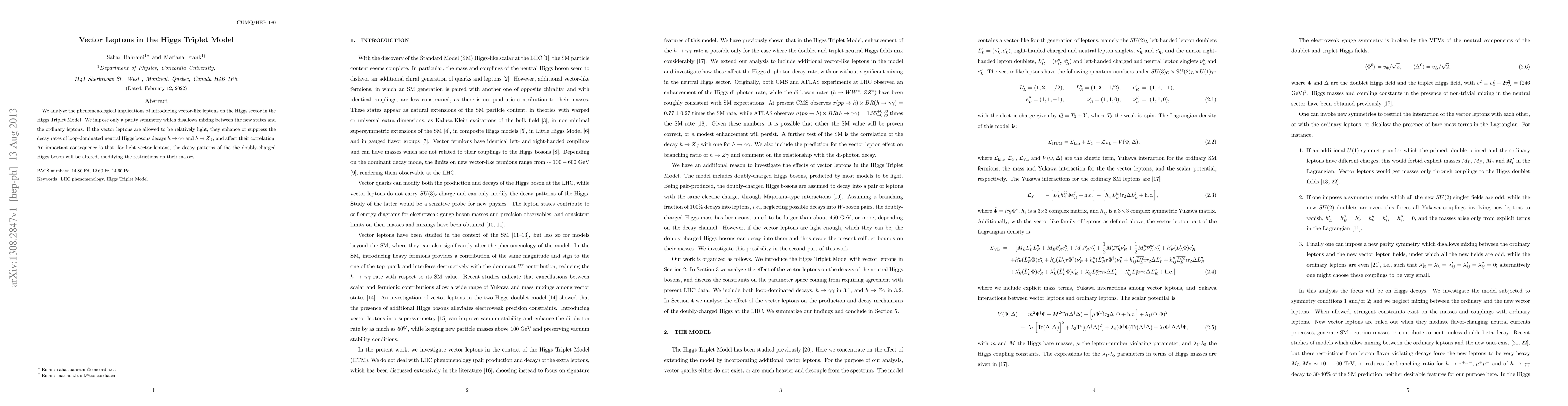 We analyze the phenomenological implications of introducing vector-like leptons on the Higgs sector in the Higgs Triplet Model. We impose only a parity symmetry which disallows mixing between the new states and the ordinary leptons. If the vector leptons are allowed to be relatively light, they enhance or suppress the decay rates of loop-dominated neutral Higgs bosons decays h -> gamma gamma and h -> Z gamma, and affect their correlation. An important consequence is that, for light vector leptons, the decay patterns of the the doubly-charged Higgs boson will be altered, modifying the restrictions on their masses.