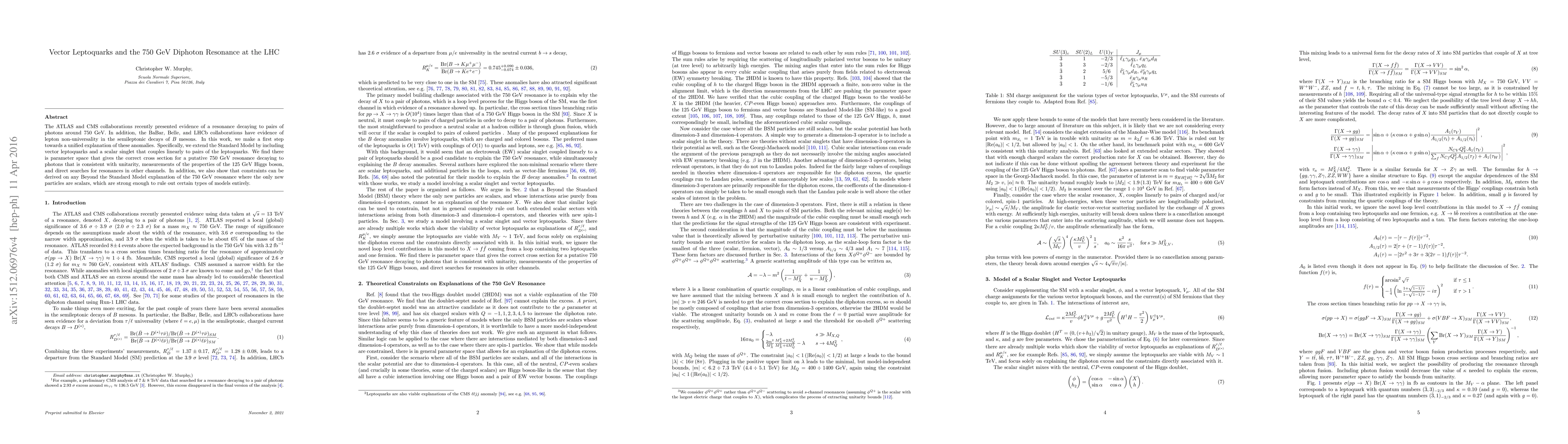 The ATLAS and CMS collaborations recently presented evidence of a resonance decaying to pairs of photons around 750 GeV. In addition, the BaBar, Belle, and LHCb collaborations have evidence of lepton non-universality in the semileptonic decays of $B$ mesons. In this work, we make a first step towards a unified explanation of these anomalies. Specifically, we extend the Standard Model by including vector leptoquarks and a scalar singlet that couples linearly to pairs of the leptoquarks. We find there is parameter space that gives the correct cross section for a putative 750 GeV resonance decaying to photons that is consistent with unitarity, measurements of the properties of the 125 GeV Higgs boson, and direct searches for resonances in other channels. In addition, we also show that constraints can be derived on any Beyond the Standard Model explanation of the 750 GeV resonance where the only new particles are scalars, which are strong enough to rule out certain types of models entirely.