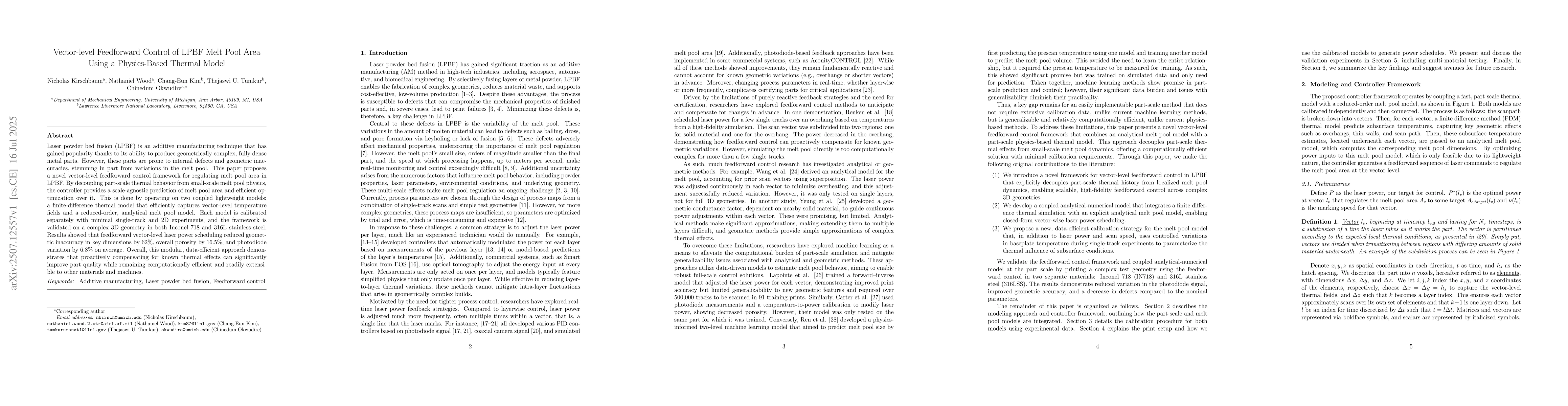 Laser powder bed fusion (LPBF) is an additive manufacturing technique that has gained popularity thanks to its ability to produce geometrically complex, fully dense metal parts. However, these parts are prone to internal defects and geometric inaccuracies, stemming in part from variations in the melt pool. This paper proposes a novel vector-level feedforward control framework for regulating melt pool area in LPBF. By decoupling part-scale thermal behavior from small-scale melt pool physics, the controller provides a scale-agnostic prediction of melt pool area and efficient optimization over it. This is done by operating on two coupled lightweight models: a finite-difference thermal model that efficiently captures vector-level temperature fields and a reduced-order, analytical melt pool model. Each model is calibrated separately with minimal single-track and 2D experiments, and the framework is validated on a complex 3D geometry in both Inconel 718 and 316L stainless steel. Results showed that feedforward vector-level laser power scheduling reduced geometric inaccuracy in key dimensions by 62%, overall porosity by 16.5%, and photodiode variation by 6.8% on average. Overall, this modular, data-efficient approach demonstrates that proactively compensating for known thermal effects can significantly improve part quality while remaining computationally efficient and readily extensible to other materials and machines.