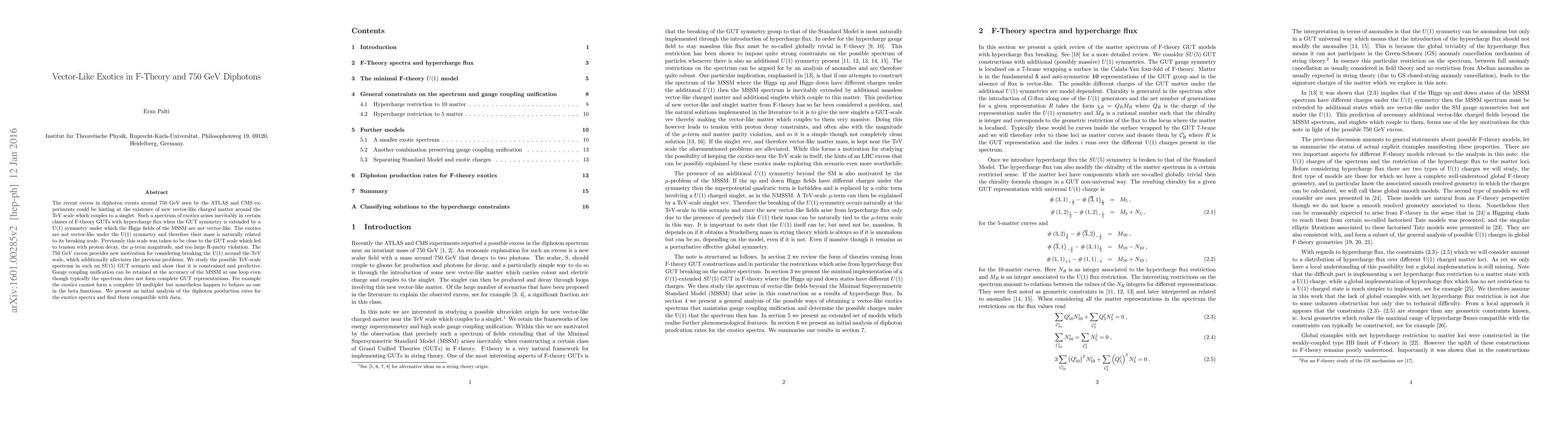 The recent excess in diphoton events around 750 GeV seen by the ATLAS and CMS experiments could be hinting at the existence of new vector-like charged matter around the TeV scale which couples to a singlet. Such a spectrum of exotics arises inevitably in certain classes of F-theory GUTs with hypercharge flux when the GUT symmetry is extended by a U(1) symmetry under which the Higgs fields of the MSSM are not vector-like. The exotics are not vector-like under the U(1) symmetry and therefore their mass is naturally related to its breaking scale. Previously this scale was taken to be close to the GUT scale which led to tension with proton decay, the $\mu$-term magnitude, and too large R-parity violation. The 750 GeV excess provides new motivation for considering breaking the U(1) around the TeV scale, which additionally alleviates the previous problems. We study the possible TeV-scale spectrum in such an SU(5) GUT scenario and show that it is constrained and predictive. Gauge coupling unification can be retained at the accuracy of the MSSM at one loop even though typically the spectrum does not form complete GUT representations. For example the exotics cannot form a complete 10 multiplet but nonetheless happen to behave as one in the beta functions. We present an initial analysis of the diphoton production rates for the exotics spectra and find them compatible with data.