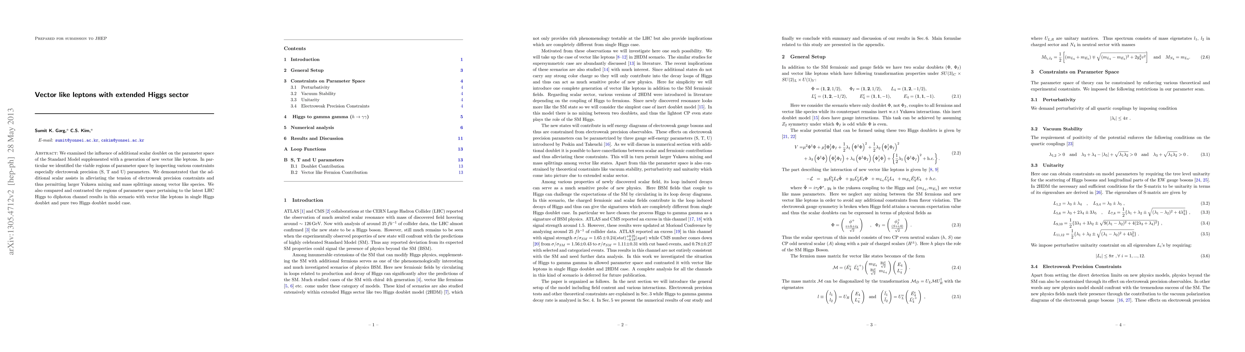 We examined the influence of additional scalar doublet on the parameter space of the Standard Model supplemented with a generation of new vector like leptons. In particular we identified the viable regions of parameter space by inspecting various constraints especially electroweak precision (S, T and U) parameters. We demonstrated that the additional scalar assists in alleviating the tension of electroweak precision constraints and thus permitting larger Yukawa mixing and mass splittings among vector like species. We also compared and contrasted the regions of parameter space pertaining to the latest LHC Higgs to diphoton channel results in this scenario with vector like leptons in single Higgs doublet and pure two Higgs doublet model case.
