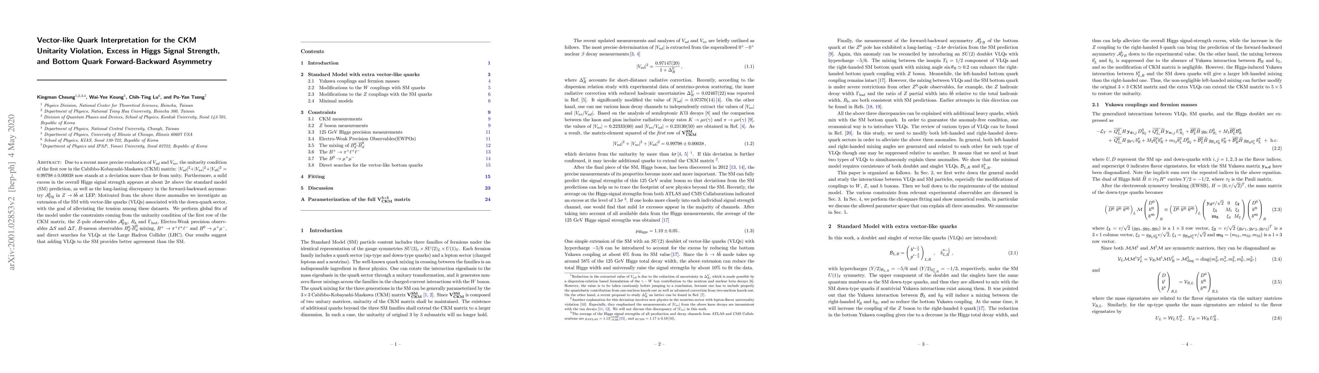 Due to a recent more precise evaluation of $V_{ud}$ and $V_{us}$, the unitarity condition of the first row in the Cabibbo-Kobayashi-Maskawa (CKM) matrix: $|V_{ud}|^2 + |V_{us}|^2 + |V_{ub}|^2 = 0.99798 \pm 0.00038$ now stands at a deviation more than $4\sigma$ from unity. Furthermore, a mild excess in the overall Higgs signal strength appears at about $2\sigma$ above the standard model (SM) prediction, as well as the long-lasting discrepancy in the forward-backward asymmetry ${\cal A}_{\rm FB}^b$ in $Z\to b\bar b$ at LEP. Motivated from the above three anomalies we investigate an extension of the SM with vector-like quarks (VLQs) associated with the down-quark sector, with the goal of alleviating the tension among these datasets. We perform global fits of the model under the constraints coming from the unitarity condition of the first row of the CKM matrix, the $Z$-pole observables ${\cal A}_{\rm FB}^b$, $R_b$ and $\Gamma_{\rm had}$, Electro-Weak precision observables $\Delta S$ and $\Delta T$, $B$-meson observables $B_d^0$-$\overline{B}_d^0$ mixing, $B^+ \to \pi^+ \ell^+ \ell^-$ and $B^0 \to \mu^+ \mu^-$, and direct searches for VLQs at the Large Hadron Collider (LHC). Our results suggest that adding VLQs to the SM provides better agreement than the SM.