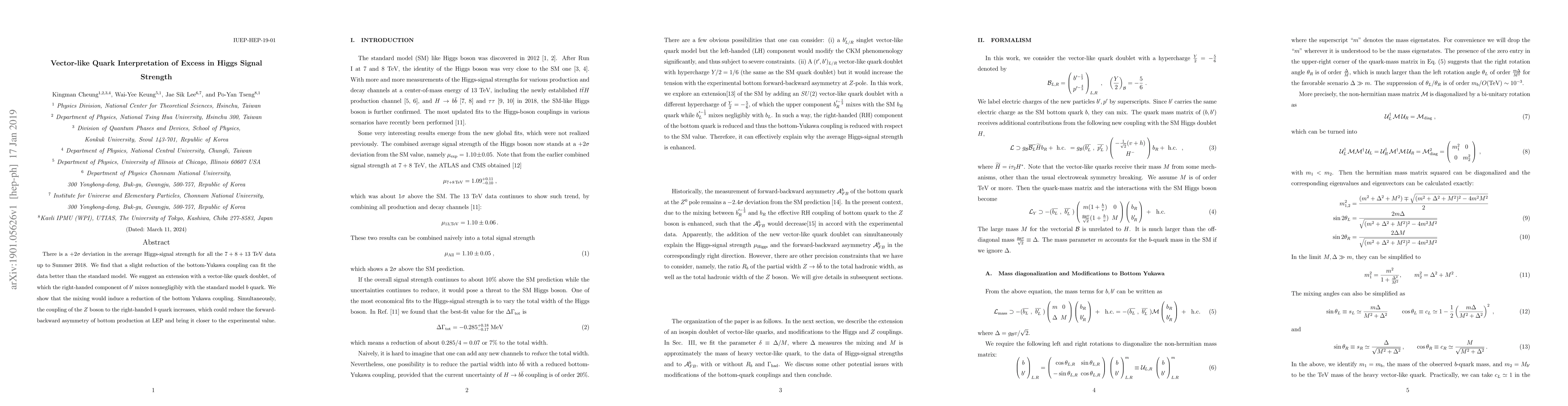 There is a $+2\sigma$ deviation in the average Higgs-signal strength for all the $7+8+13$ TeV data up to Summer 2018. We find that a slight reduction of the bottom-Yukawa coupling can fit the data better than the standard model. We suggest an extension with a vector-like quark doublet, of which the right-handed component of $b'$ mixes nonnegligibly with the standard model $b$ quark. We show that the mixing would induce a reduction of the bottom Yukawa coupling. Simultaneously, the coupling of the $Z$ boson to the right-handed $b$ quark increases, which could reduce the forward-backward asymmetry of bottom production at LEP and bring it closer to the experimental value.