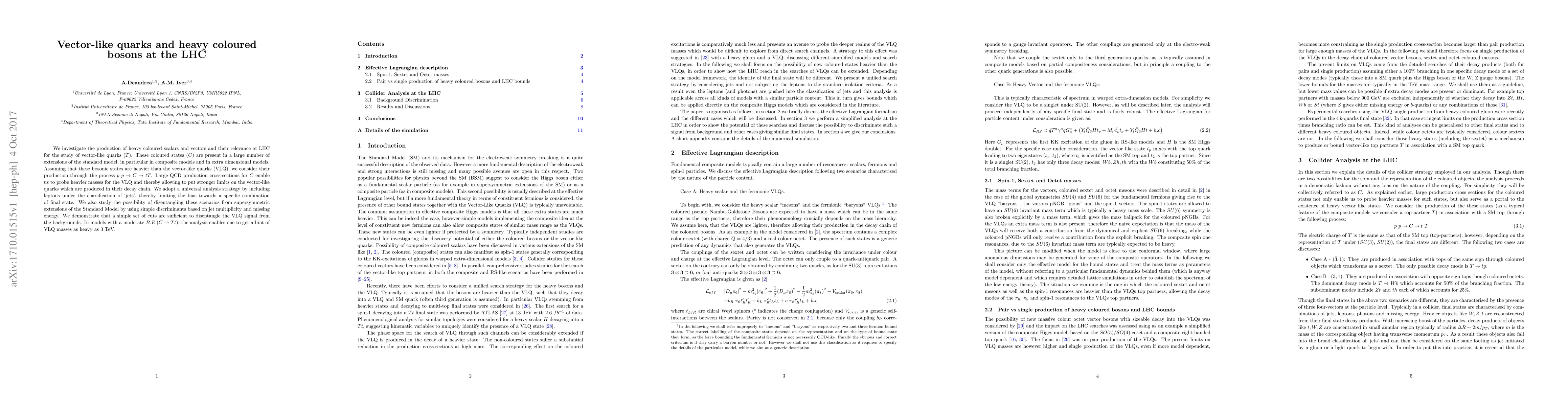 We investigate the production of heavy coloured scalars and vectors and their relevance at LHC for the study of vector-like quarks ($T$). These coloured states ($C$) are present in a large number of extensions of the standard model, in particular in composite models and in extra dimensional models. Assuming that these bosonic states are heavier than the vector-like quarks (VLQ), we consider their production through the process $p~p\rightarrow C\rightarrow tT$. Large QCD production cross-sections for $C$ enable us to probe heavier masses for the VLQ and thereby allowing to put stronger limits on the vector-like quarks which are produced in their decay chain. We adopt a universal analysis strategy by including leptons under the classification of `jets', thereby limiting the bias towards a specific combination of final state. We also study the possibility of disentangling these scenarios from supersymmetric extensions of the Standard Model by using simple discriminants based on jet multiplicity and missing energy. We demonstrate that a simple set of cuts are sufficient to disentangle the VLQ signal from the backgrounds. In models with a moderate $B.R.(C\rightarrow Tt)$, the analysis enables one to get a hint of VLQ masses as heavy as 3 TeV.