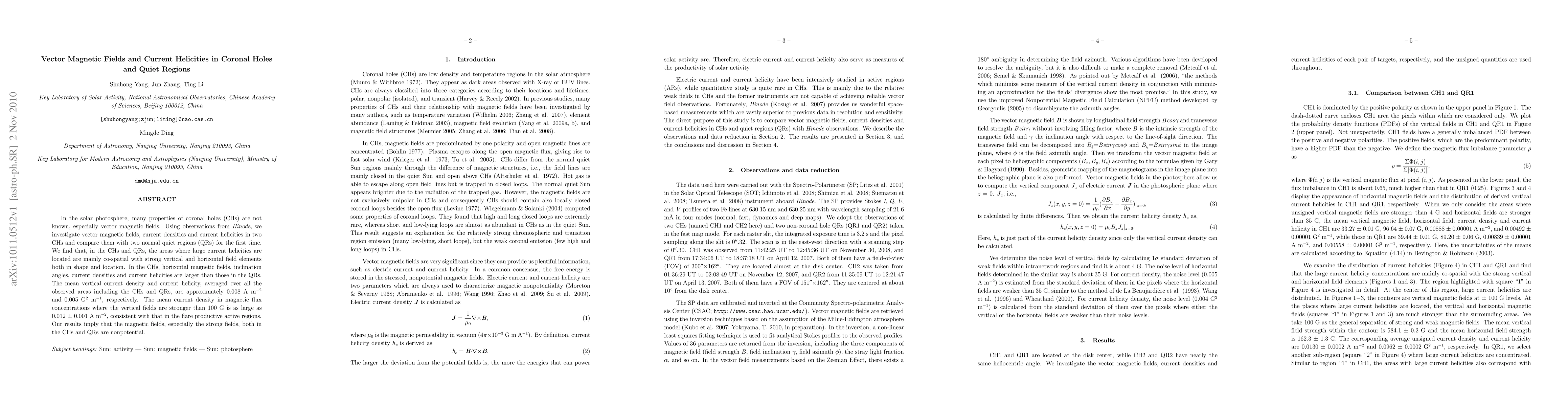 This study compares vector magnetic fields, current densities, and current helicities in coronal holes and quiet regions using Hinode observations, revealing that areas with large current helicities align with strong vertical and horizontal fields. It finds that coronal holes exhibit higher horizontal magnetic fields, inclination angles, current densities, and current helicities compared to quiet regions.