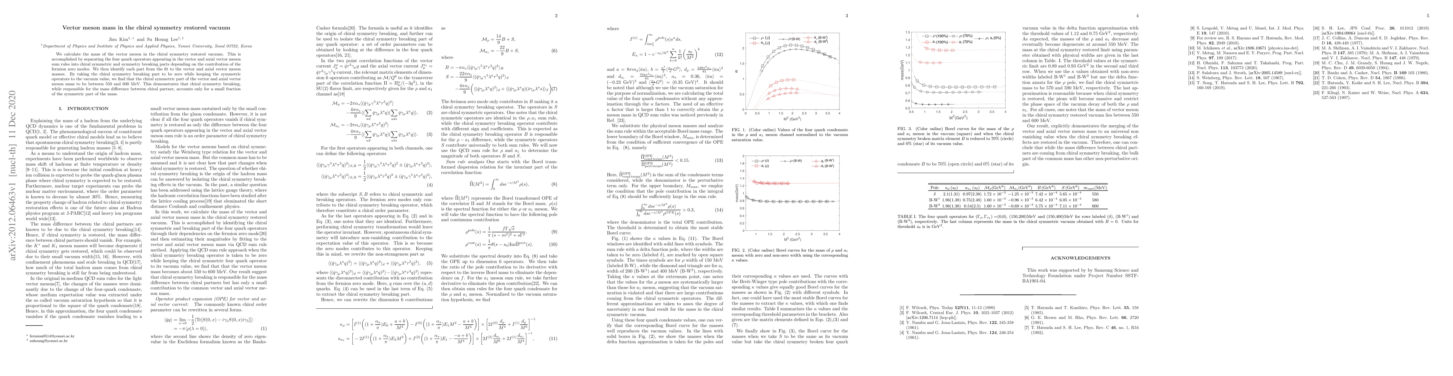 We calculate the mass of the vector meson in the chiral symmetry restored vacuum. This is accomplished by separating the four quark operators appearing in the vector and axial vector meson sum rules into chiral symmetric and symmetry breaking parts depending on the contribution of the fermion zero modes. We then identify each part from the fit to the vector and axial vector meson masses. By taking the chiral symmetry breaking part to be zero while keeping the symmetric operator to the vacuum value, we find that the chiral symmetric part of the vector and axial vector meson mass to be between 550 and 600 MeV. This demonstrates that chiral symmetry breaking, while responsible for the mass difference between chiral partner, accounts only for a small fraction of the symmetric part of the mass.