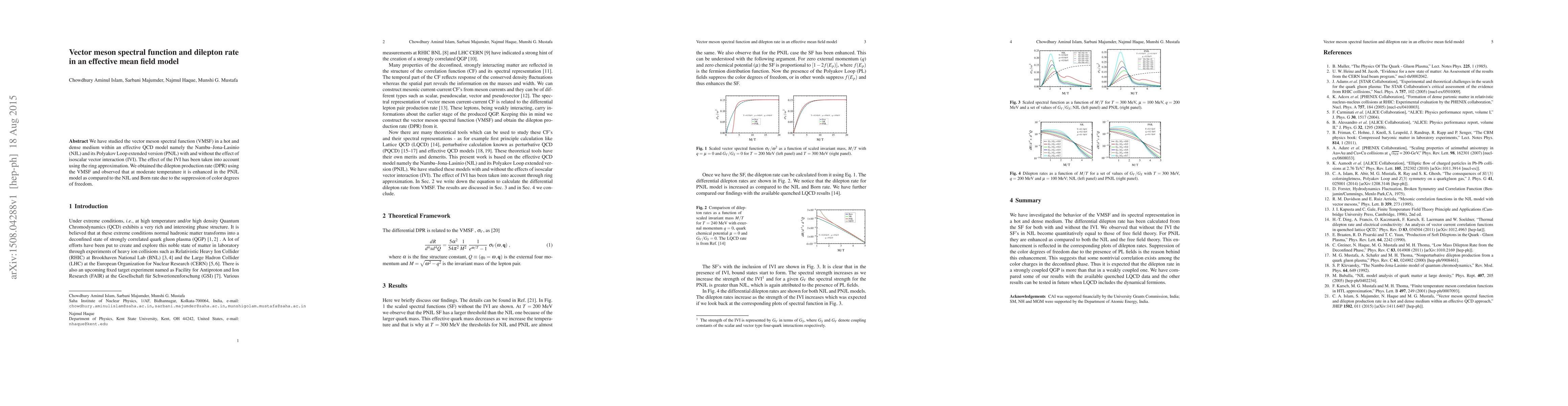 This paper investigates the vector meson spectral function in a hot and dense medium using the NJL and PNJL models, finding that the dilepton production rate is enhanced in the PNJL model due to the suppression of color degrees of freedom, especially with the inclusion of isoscalar vector interaction.
