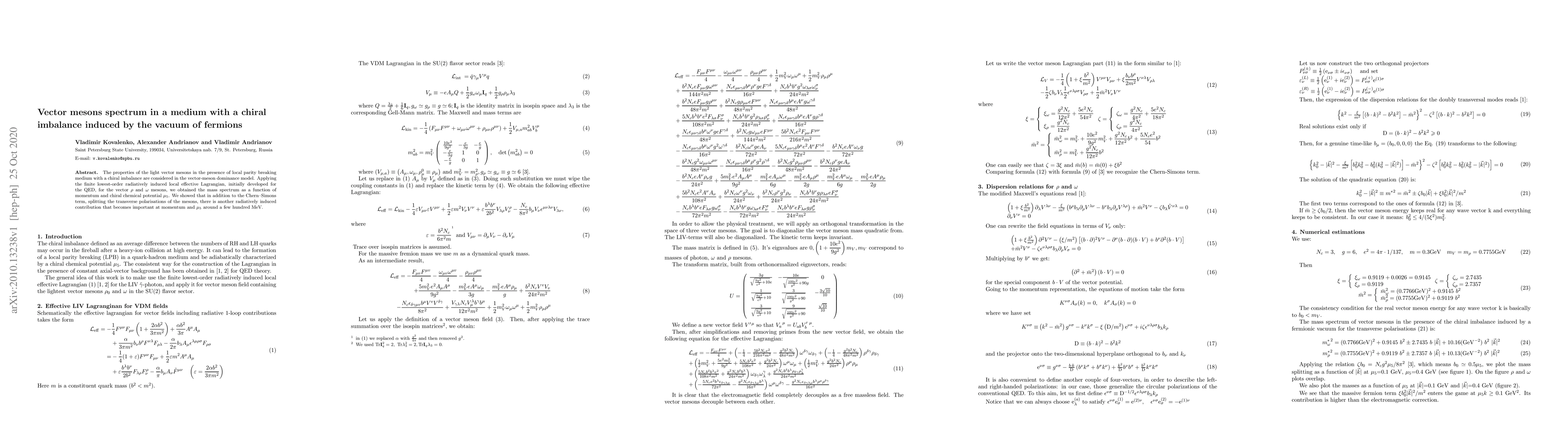 This paper investigates the light vector mesons' properties in a medium with chiral imbalance using the vector-meson dominance model. It finds a significant radiatively induced mass spectrum contribution alongside the Chern-Simons term, particularly at momentum and chiral chemical potential values around 300 MeV.