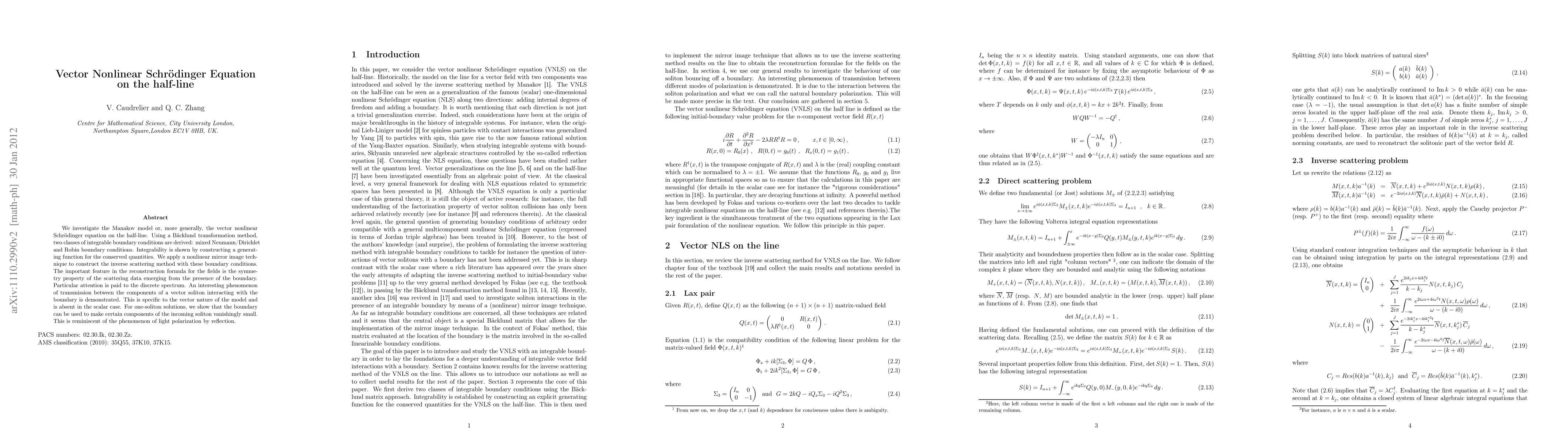 We investigate the Manakov model or, more generally, the vector nonlinear Schr\"odinger equation on the half-line. Using a B\"acklund transformation method, two classes of integrable boundary conditions are derived: mixed Neumann/Dirichlet and Robin boundary conditions. Integrability is shown by constructing a generating function for the conserved quantities. We apply a nonlinear mirror image technique to construct the inverse scattering method with these boundary conditions. The important feature in the reconstruction formula for the fields is the symmetry property of the scattering data emerging from the presence of the boundary. Particular attention is paid to the discrete spectrum. An interesting phenomenon of transmission between the components of a vector soliton interacting with the boundary is demonstrated. This is specific to the vector nature of the model and is absent in the scalar case. For one-soliton solutions, we show that the boundary can be used to make certain components of the incoming soliton vanishingly small. This is reminiscent of the phenomenon of light polarization by reflection.