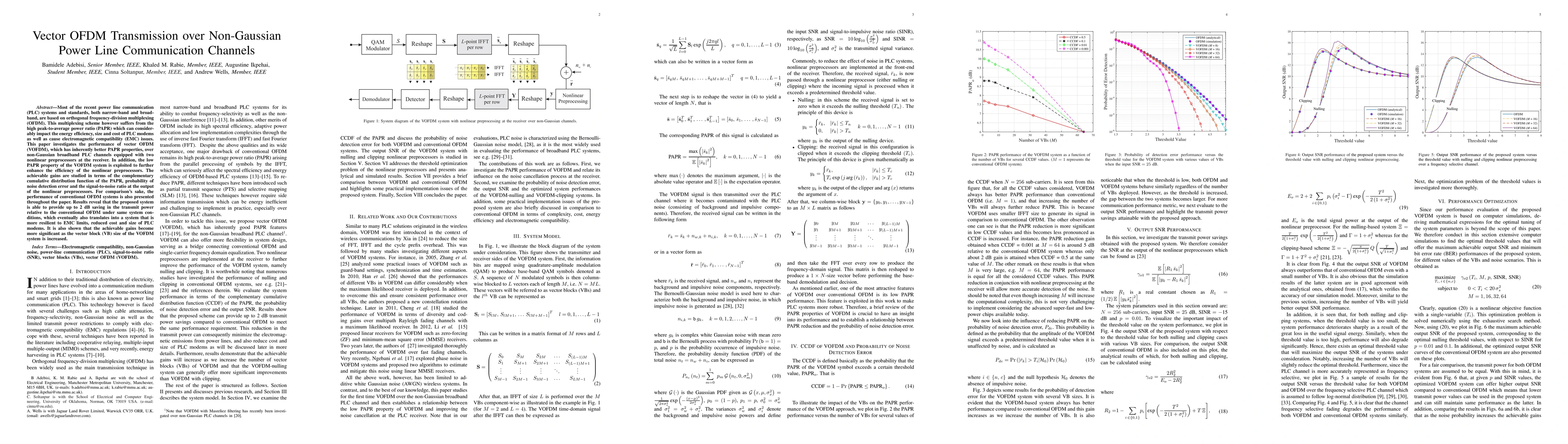 Most of the recent power line communication (PLC) systems and standards, both narrow-band and broadband, are based on orthogonal frequency-division multiplexing (OFDM). This multiplexing scheme however suffers from the high peak-to-average power ratio (PAPR) which can considerably impact the energy efficiency, size and cost of PLC modems as well as cause electromagnetic compatibility (EMC) issues. This paper investigates the performance of vector OFDM (VOFDM), which has inherently better PAPR properties, over non-Gaussian broadband PLC channels equipped with two nonlinear preprocessors at the receiver. In addition, the low PAPR property of the VOFDM system is exploited to further enhance the efficiency of the nonlinear preprocessors. The achievable gains are studied in terms of the complementary cumulative distribution function of the PAPR, probability of noise detection error and the signal-to-noise ratio at the output of the nonlinear preprocessors. For comparison's sake, the performance of conventional OFDM systems is also presented throughout the paper. Results reveal that the proposed system is able to provide up to 2 dB saving in the transmit power relative to the conventional OFDM under same system conditions, which eventually also translates into a system that is more resilient to EMC limits, reduced cost and size of PLC modems. It is also shown that the achievable gains become more significant as the vector block (VB) size of the VOFDM system is increased.