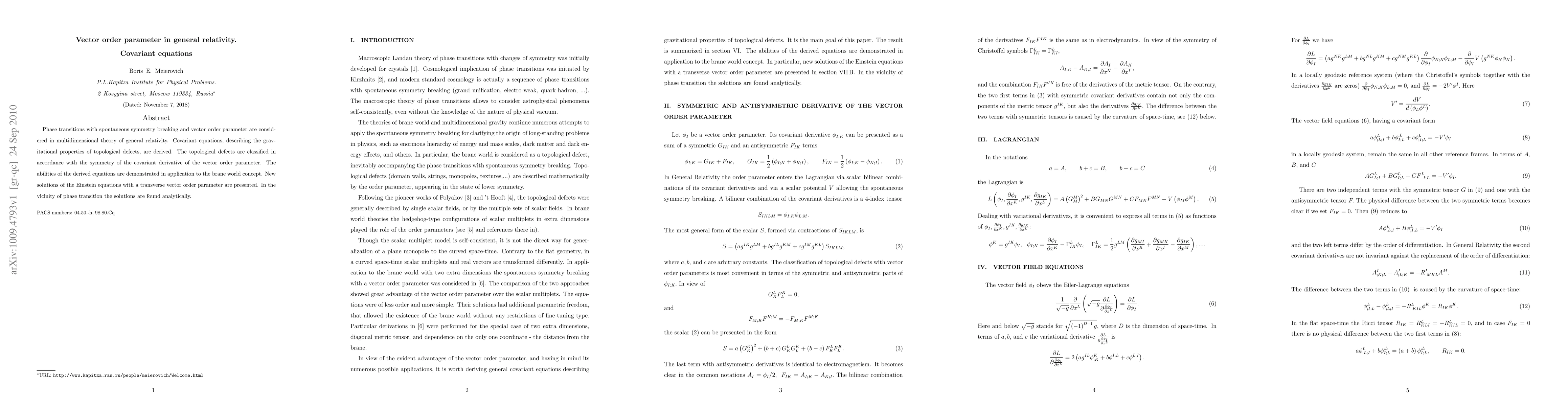 This paper derives covariant equations for vector order parameters in general relativity, focusing on phase transitions with spontaneous symmetry breaking. It classifies topological defects based on the symmetry of the covariant derivative and applies these equations to the brane world concept, presenting new solutions of the Einstein equations with a transverse vector order parameter, found analytically near phase transitions.